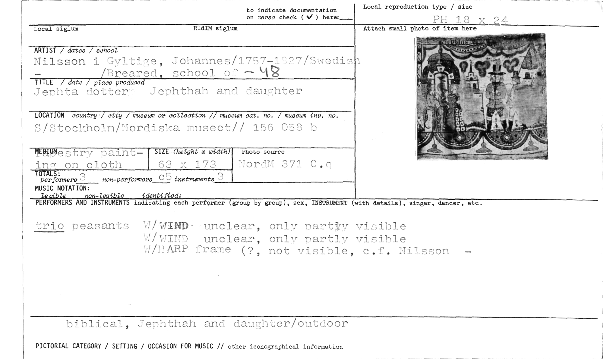//// trio peasants unclear, only partky visible //// W/WIND unclear, only oartly visible N/PARP frame (?, not visible, c. f. Nilsson //// biblical, Jephthah and daughter/outdoor //// PICTORIAL CATEGORY / SETTING / OCCASION FOR MUSIC // other iconographical information //// Attach small photo of item here //// Local siglum RIdIM siglum //// to indicate documentation //// on verso check (V) here:_ //// Local reproduction type / size //// Pil 18 x 24 //// ARTIST / dates / school //// Nilsson i Gyltige, Johannes/1757-1727 Swedis'q /Breared, school of - //// TITLE / date / place produced //// Jerhta dotter Jephthah and daughter //// LOCATION country / city / museum or collection // museum cat. no. / museum 'ulv. no. //// S/Stockholm/Nordiska museet// 156 058 b //// TRIMestry paint- ing on cloth SIZE (height x width) Photo source C.o //// 63 x 173 7:TordM 371 //// PERFORMERS AND INSTRUMENTS indicating each performer (group by group), sex, INSTRUMENT (with //// "44 //// -TOMS: //// per formers 3 non-perfbrmers cS instruments 3 //// MUSIC NOTATION: //// levible nenz-leaible_ //// details), singer, dancer, etc. ////