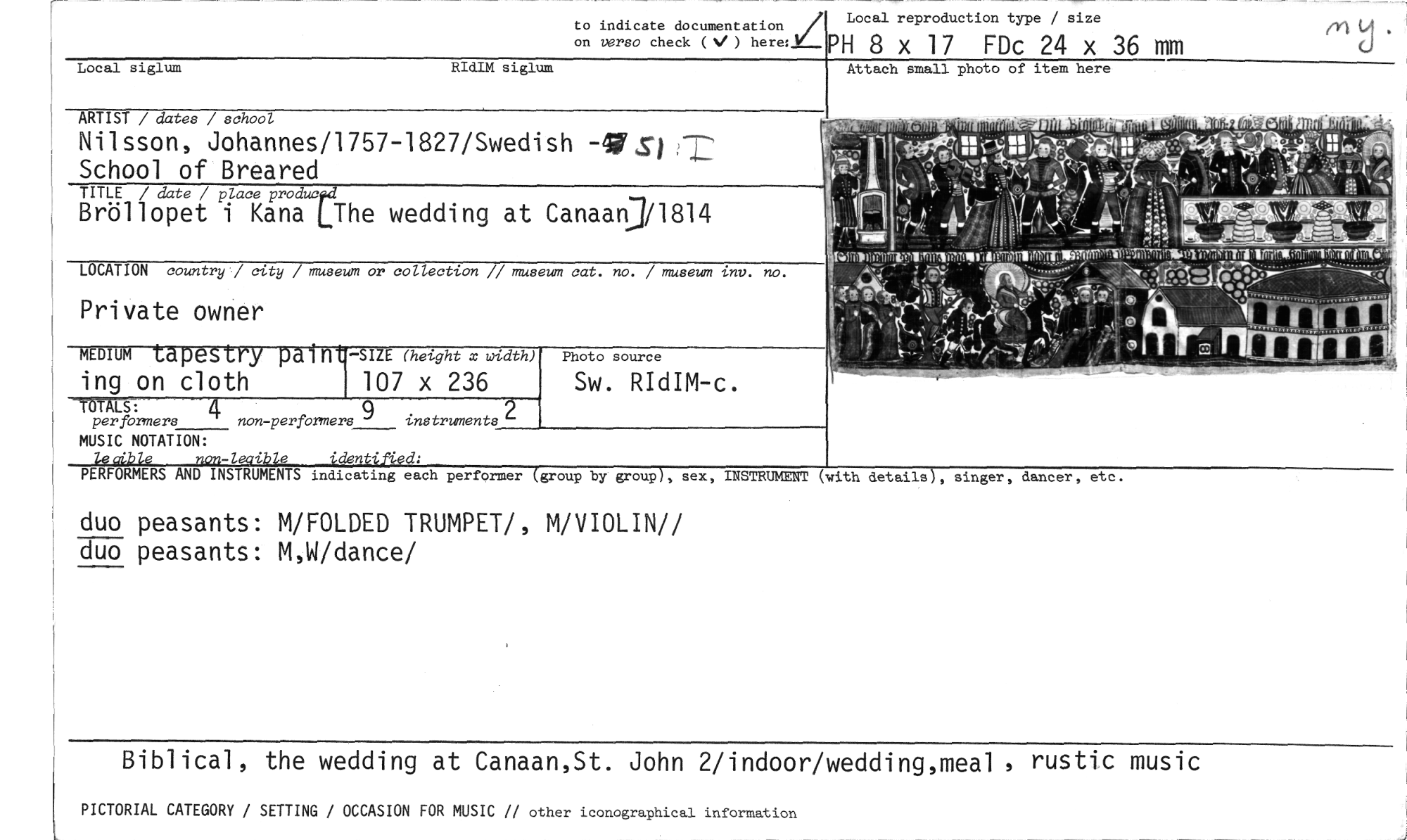 //// to indicate documentation Local reproduction type / size //// _v_/1. //// on versa check ( N/ ) here: PH 8 x 17 FDc 24 x 36 mm //// MUSIC NOTATION: //// lecible non-leaible identified: //// PERFORMERS AND INSTRUMENTS indicating each performer (group by group), sex, //// duo peasants: M/FOLDED TRUMPET!, M/VIOLIN// duo peasants: M,W/dance/ //// INSTRUMENT (with details), singer, dancer, etc. //// Biblical, the wedding at Canaan,St. John 2/indoor/wedding,meal rustic music //// PICTORIAL CATEGORY / SETTING / OCCASION FOR MUSIC // other iconographical information //// Attach small photo of item here //// RIdIM siglum //// Local siglum //// ARTIST / dates / school //// Nilsson, Johannes/1757-1827/Swedish -1,s; School of Breared //// TITLE / date / place producpd //// Bröllopet i Kana The wedding at Canaanj/1814 //// LOCATION country / city / museum or collection // museum cat. no. / museum inv. no. //// Private owner //// MEDIUM tapestry pain (hetght x width) //// ing on cloth 107 x 236 //// TÖTALS: 4 //// per formers non-per formers 9 instruments 2 //// Photo source //// Sw. RIdIM-c. //// o m n . • 41 //// tt. 7.1 P- /iw( mearre--,Ko. //// et, tid- //// 171 H //// i.416,1k7;411 //// Wril07119-ibtelingårakeRMLMTITLYrrinZei. vrliwkw .7riTTrunnimc7tvirfraig , ////