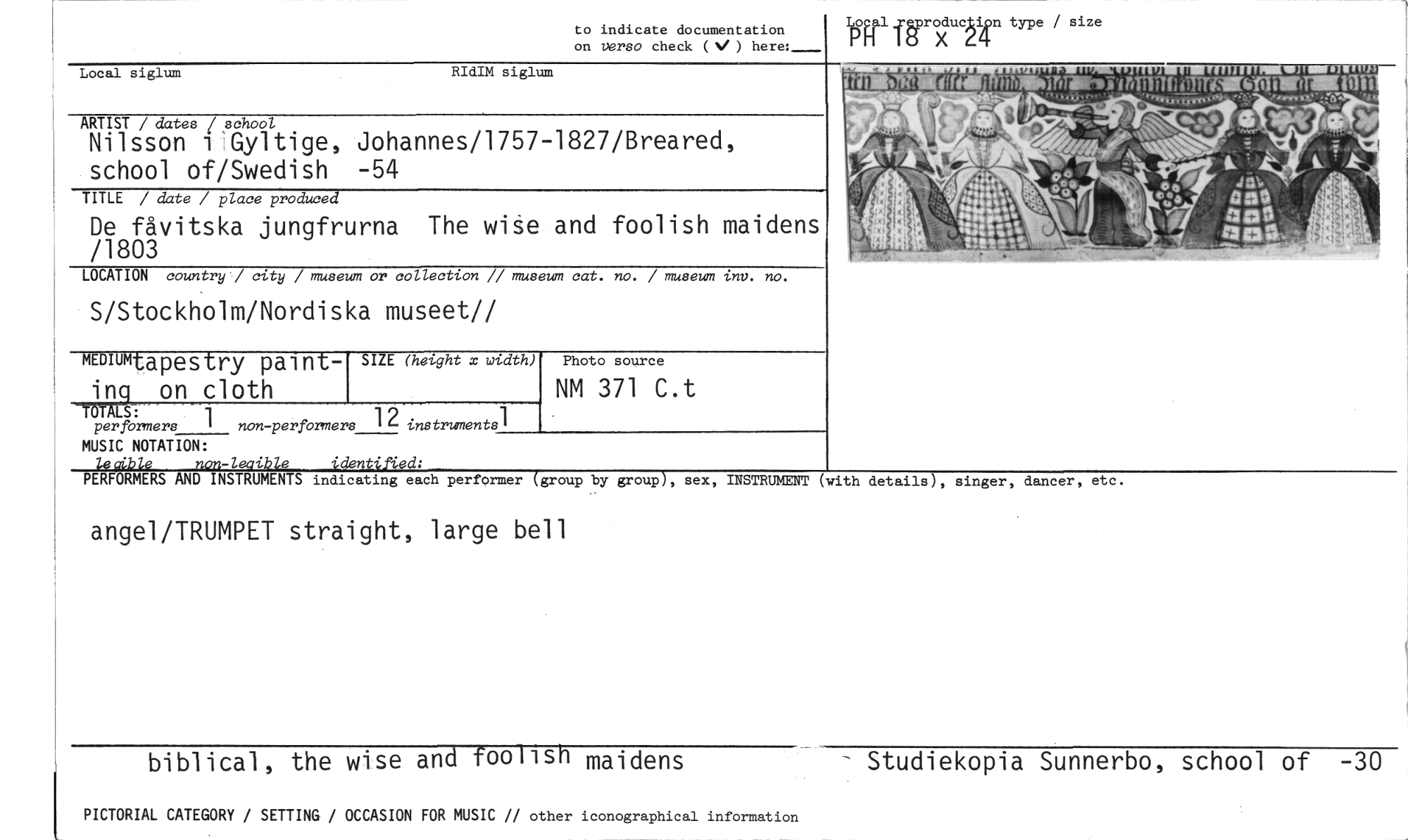 //// to indicate documentation //// on versa check (V ) here:_ //// Ityrra 146 irAp XroducAlin type / size //// LI4 //// Local siglum RIdIM siglum //// ARTIST / dates i school //// Nilsson i Gyltige, Johannes/1757-1827/Breared, school of/Swedish -54 //// TITLE / date / place produced //// De fåvitska jungfrurna The wire and foolish maidens /1803 //// it I $1,PEriewudiu-4)mil6n4 M //// 1TTITPMWITIIINFOlTmil //// s - //// 67 ;74. . ... //// ' qh //// LOCATION country / city / museum or collection // museum cat. no. / museum inv. no. //// S/Stockholm/Nordiska museet// //// MEMMta pestry paint- SIZE (height x width) Photo source //// inqon cloth NM 371 C.t //// TÖTALS: //// per formers 1 non -perfbrmers 12 instruments] //// MUSIC NOTATION: //// tecible non-leaible identified; //// PERFORMERS AND INSTRUMENTS indicating each performer (group by group), sex, INSTRUMENT //// angel/TRUMPET straight, large bell //// (with details), singer, dancer, etc. //// biblical, the wise and footisn maidens Studiekopia Sunnerbo, school of -30 //// PICTORIAL CATEGORY / SETTING / OCCASION FOR MUSIC // other iconographical information ////