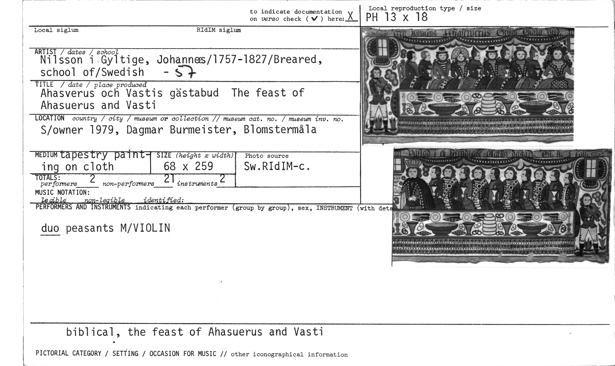 //// to indicate documentation v //// on versa check (V) here: A //// Local reproduction type / size //// PH 13 x 18 //// 1.111#1—,.rnifie — 42, //// . . //// ---r- //// Local siglum RIdIM siglum //// ARTIST / dates / school //// Nilsson i Gyltige, Johannes/1757-1827/Breared, school of/Swedish - //// TITLE / date / place produced //// Ahasverus och Vastis gästabud The feast of Ahasuerus and Vasti //// LOCATION country / city / museum or collection // museum cat. no. / museum inv. no. //// S/owner 1979, Dagmar Burmeister, Blomstermåla //// .,.41111111.- , //// MEDIUM tapestry paint- //// ing on cloth //// Photo source //// Sw.RIdIM-c. //// SIZE (height x width) //// 68 x 259 //// Te 'LS: //// per formers non-performers instruments //// MUSIC NOTATION: //// 4d l-.ip e *den //// ied: //// INSTRUMENTS indicating each performer //// PERFORMERS AND //// group by group , sex, INSTRUMENT (with det //// duo peasants M/VIOLIN //// mrtIXISC,T, //// ''' • ' //// biblical, the feast of Ahasuerus and Vasti //// PICTORIAL CATEGORY / SETTING / OCCASION FOR MUSIC // other iconographical information ////