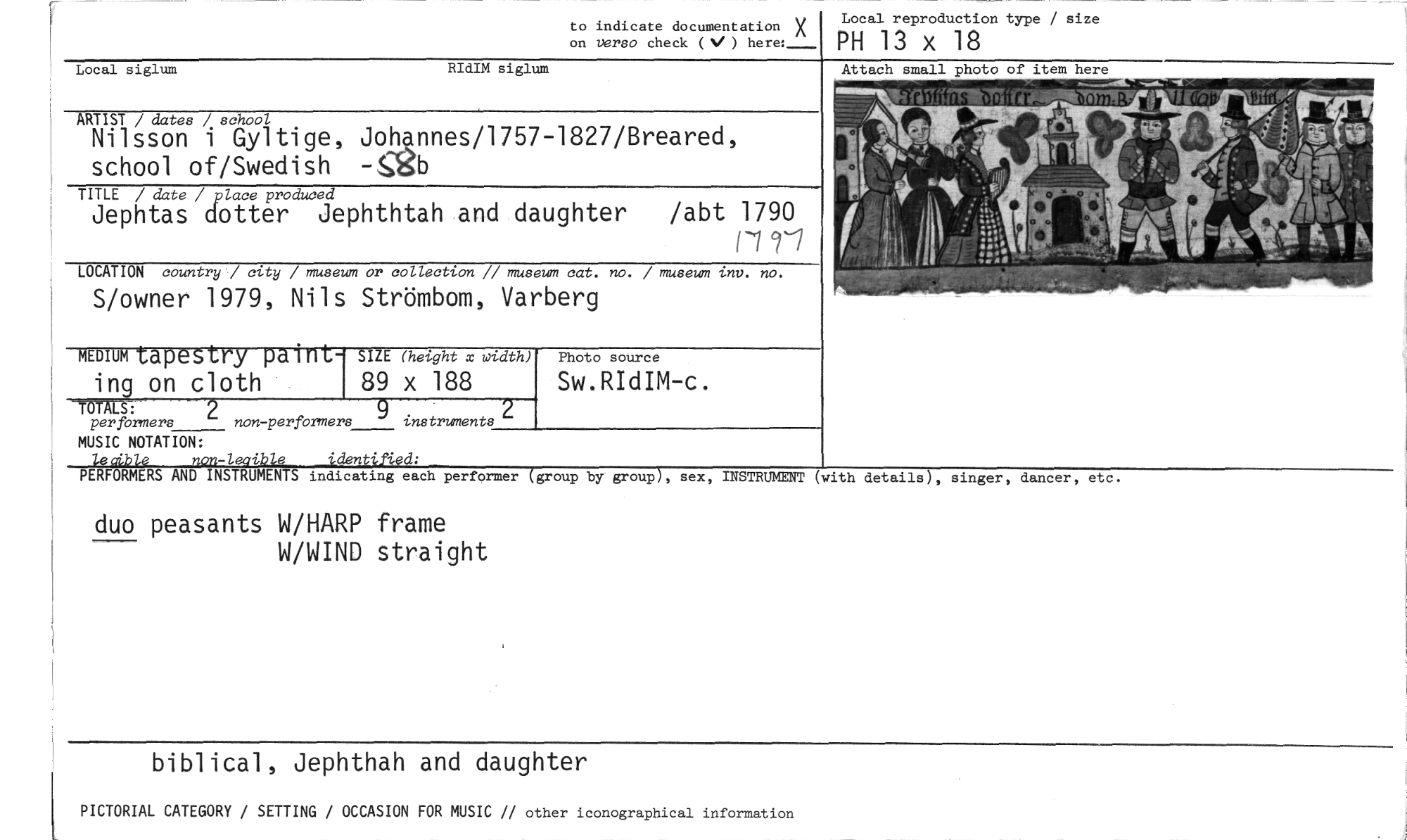 //// to indicate documentation X on verso check (V) here:_ //// Local reproduction type / size //// PH 13 x 18 //// Local siglum RIdIM siglum //// ARTIST / dates / school //// Nilsson i Gyltige, Johannes/1757-1827/Breared, school of/Swedish //// TITLE / date /pluce produced //// Jephtas dotter Jephthtah and daughter /abt 1790 //// I-791 //// LOCATION country / city / museum or collection // museum cat. no. / museum inv. no. //// S/owner 1979, Nils Strömbom, Varberg //// MEDIUM tapestry paint- //// ing on cloth //// SIZE (height x width) //// 89 x 188 //// Photo source //// Sw.RIdIM-c. //// LS: //// per formers //// non-perfOrmers instruments //// MUSIC NOTATION: //// letible non-leaible identified: //// PERFORMERS AND INSTRUMENTS indicating each performer (group by group), sex, INSTRUMENT //// duo peasants W/HARP frame //// W/WIND straight //// (with details), singer, dancer, etc. //// biblical, Jephthah and daughter //// PICTORIAL CATEGORY / SETTING / OCCASION FOR MUSIC // other iconographical information ////