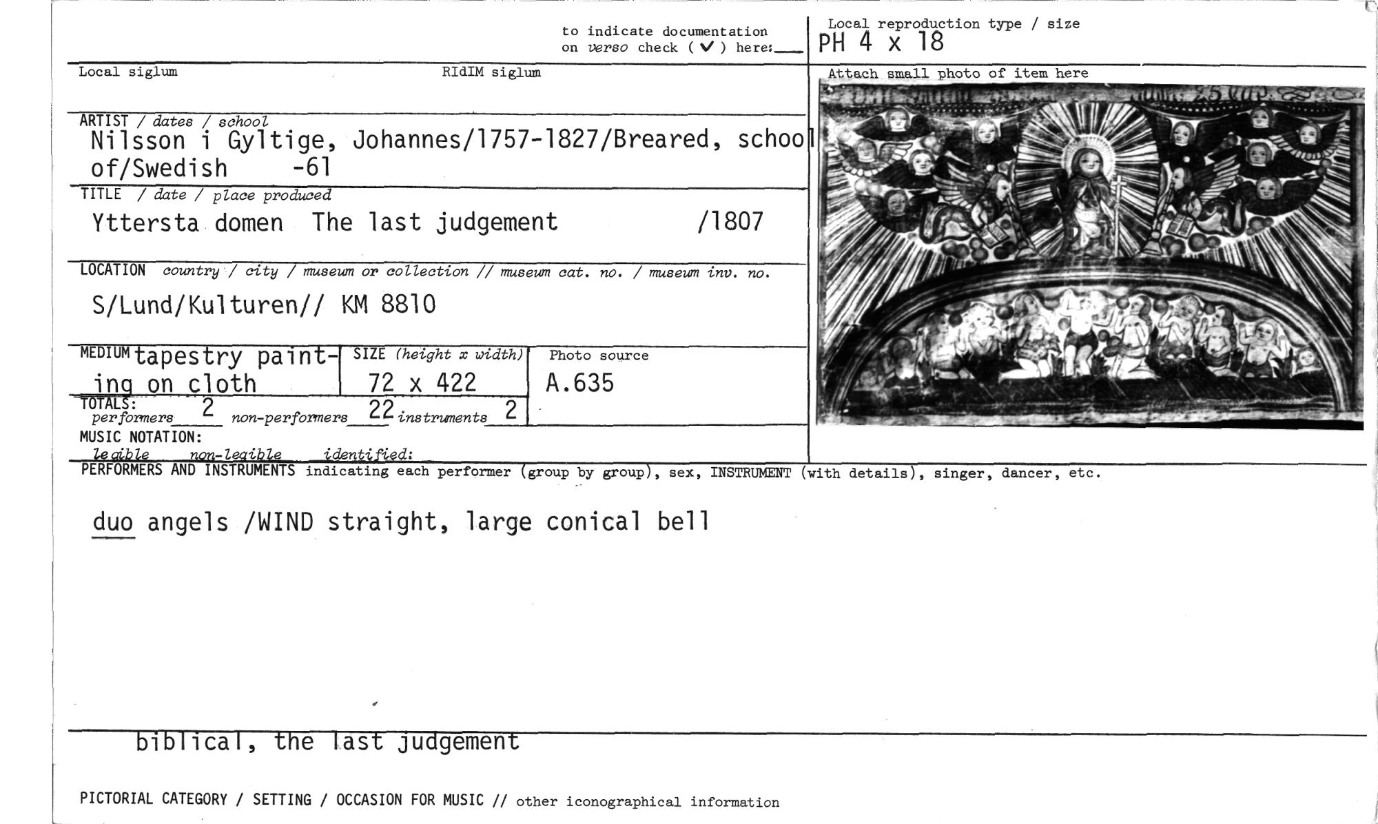 //// to indicate documentation on versa check ( ) here: //// Local reproduction type / size //// PH 4 x 18 //// Local siglum RIdIM siglum //// ARTIST / dates / school //// Nilsson i Gyltige, Johannes/1757-1827/Breared, schoo of/Swedish -61 //// TITLE / date / place produced //// Yttersta domen The last judgement //// /1807 //// LOCATION country / city / museum or collection // museum cat. no. / museum tnv. no. //// S/Lund/Kulturen// KM 8810 //// ME"talP estry paint- SIZE (height x width) //// 72 x 422 //// Photo source //// A.635 //// ing_ on cloth //// —TÖTALS: 2 per formers non-performers //// MUSIC NOTATION: //// le aible non-leaible identified: //// PERFORMERS AND INSTRUMENTS //// 2 //// 22 instruments //// indicating each performer (group by group), sex, INSTRUMENT //// (with details), singer, dancer, etc. //// duo angels /WIND straight, large conical bell //// biblical, the last judgement //// PICTORIAL CATEGORY / SETTING / OCCASION FOR MUSIC // other iconographical information ////