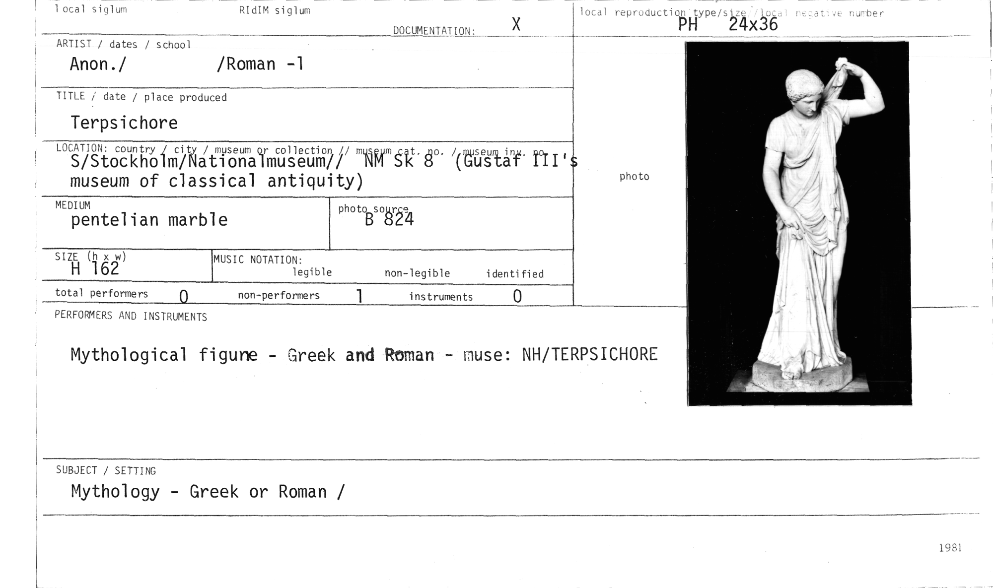 //// 1 ocal siglum //// RIdIM siglum //// DOCUMENTATION: X //// ype/si:› reJsat:ve nurober //// 24x36 //// local reproductiolb //// ARTIST / dates / school //// Anon./ //// /Roman -1 //// TITLE / date / place produced //// Terpsichore //// LOCATION: country 2 city / museum o I Sk (b //// r collection // MUrtAh. /legbiy. 101 / ,s //// S/Stockholm/Nationalmuseum// N museum of classical antiquity) //// photo //// MEDIUM //// pentelian marble //// photoBsoärn //// SIZE (h x w) //// H 162 //// C NOTATION: //// legible //// non-legible identified //// total performers //// instruments //// 0 //// PERFORMERS AND INSTRUMENTS //// Mythological figune - Greek and Roman - muse: NH/TERPSICHORE //// SUBJECT / SETTING //// Mythology - Greek or Roman / //// los' ////