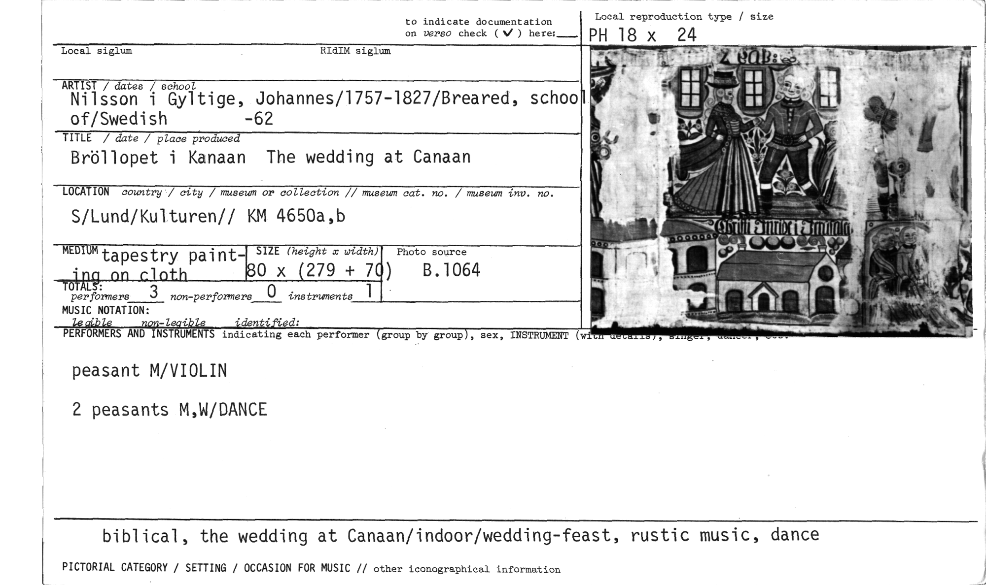 //// peasant M/VIOLIN //// 2 peasants M,W/DANCE //// biblical, the wedding at Canaan/indoor/wedding-feast, rustic music, dance //// PICTORIAL CATEGORY / SETTING / OCCASION FOR MUSIC // other iconographical information //// instruments //// SIZE (height x width) Photo source //// 80 x 279 + 7C) B.1064 //// 1 //// PERFORMERS //// AND INSTRUMENTS //// to indicate documentation //// on verso check ( ) here:_ //// Local siglum RIdIM siglum //// ARTIST / dates / school. //// Nilsson i Gyltige, Johannes/1757-1827/Breared, schoo of/Swedish -62 //// TITLE / date / place produced //// Bröllopet i Kanaan The wedding at Canaan //// LOCATION country / city / museum or collection // museum cat. no. / museum imv. no. //// S/Lund/Kulturen// KM 4650a,b //// MEDIUM tapestry paint- //// Pf P //// A II //// per formers 3 non -performers //// MUSIC NOTATION: //// i./ e 'den d: //// Local reproduction type / size //// PH 18 x 24 //// indicating each performer (group by group), sex, INSTRUMENT ////