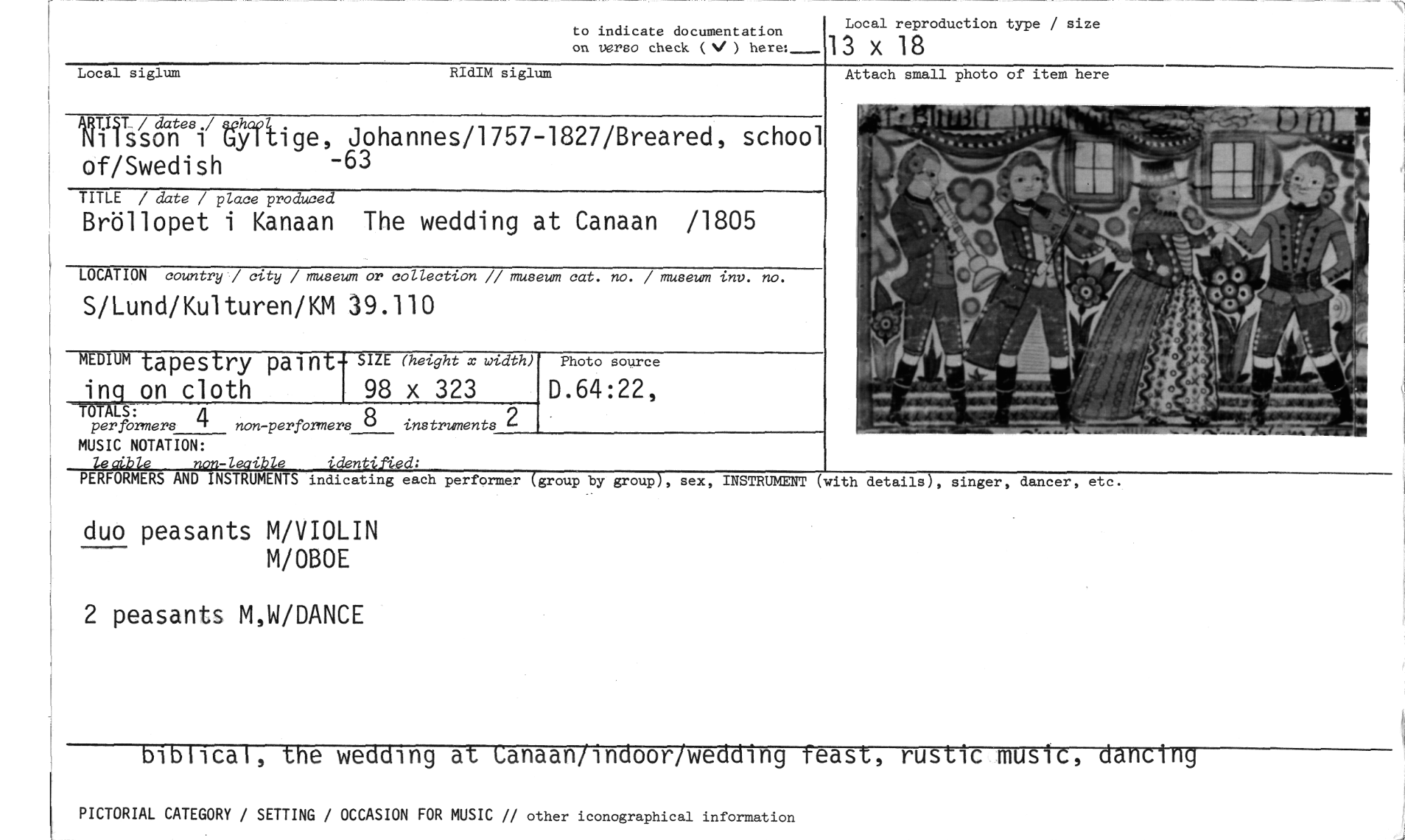 //// to indicate documentation //// Local reproduction type / size on versa check (V) here:___ 13 x 18 //// duo peasants M/VIOLIN //// M/OBOE //// 2 peasants M,W/DANCE //// biblical, the wedding at Lanaan/indoor/wedding Teast, rustic music, dancing //// PICTORIAL CATEGORY / SETTING / OCCASION FOR MUSIC // other iconographical information //// Local siglum RIdIM siglum //// ART.IST_ / dates./ achaol //// Nilsson i Gyltige, Johannes/1757-1827/Breared, school of/Swedish -63 //// TITLE / date / place produced //// Bröllopet i Kanaan The wedding at Canaan /1805 //// LOCATION country / city / museum or collection // museum cat. no. / museum inv. no. //// S/Lund/Kulturen/KM 39.110 //// MEDIUM tapestry paint- SIZE (height x width) //// inq on cloth 98 x 323 //// TÖTALS: //// per formers 4 non-performers 8 instruments 2 //// MUSIC NOTATION: //// leaible non-leaible identifi,ed; //// PERFORMERS AND INSTRUMENTS indicating each performer (group by groupY, sex, INSTRUMENT //// Attach small photo of item here //// details), singer, dancer, etc. //// (with //// Photo source //// D.64:22, ////