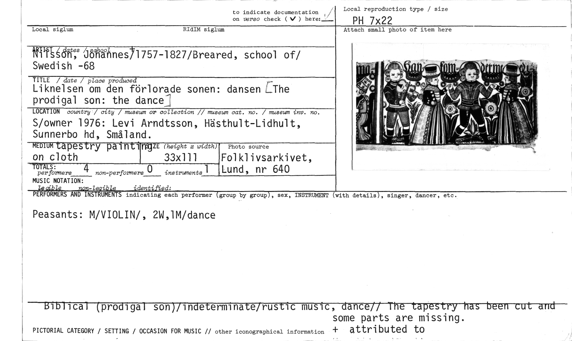 //// to indicate documentation , on versa check ( V ) Local reproduction type / size //// PH 7x22 //// Local siglum RIdIM siglum Attach small photo of item here //// (with details), singer, dancer, etc. //// beälännes71757-1827/Breared, school of/ Swedish -68 //// TITLE / date / place produced //// Liknelsen om den förlorade sonen: dansen ,._.The prodigal son: the dancel //// LOCATION country / city / museum or collection // museum cat. no. / museum inv. no. //// MUSIC NOTATION: //// non-leaible idäntified; //// PERFORMERS AND INSTRUMENTS indicating each performer (group by group), sex, INSTRUMENT //// Peasants: M/VIOLIN/, 2W,1M/dance //// S/owner 1976: Levi Arndtsson, Hästhult-Lidhult, Sunnerbo hd, Småland. //// MEDIUM tapestry pain tingzE (height x width) Photo source //// on cloth 33x111 Folklivsarkivet, //// TOTALS: 40 1 Lund, nr 640 //// per formers //// non-per formers //// instruments - //// //// Biblical (prodigal son)/indeterminate/rustic music, ance he tapestry has been cut and //// some parts are missing. //// PICTORIAL CATEGORY / SETTING / OCCASION FOR MUSIC // other iconographical information + attributed to ////