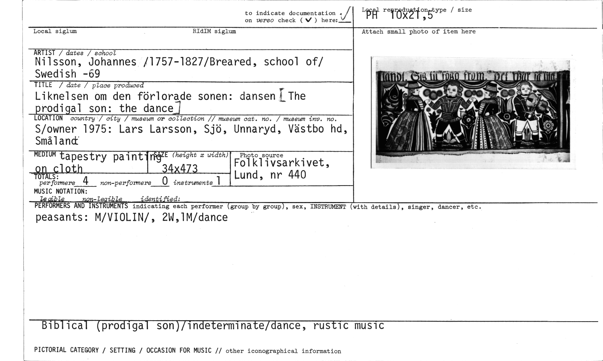 //// to indicate documentation vi //// on versa check ( ) here: //// LT4111 relretorstype / size //// Local siglum RIdIM siglum //// ARTIST / dates / school //// Nilsson, Johannes /1757-1827/Breared, school of/ Swedish -69 //// TITLE / date / place produced //// Liknelsen om den förlorade sonen: dansen IThe //// prodigal son: the dance] //// LOCATION country / city / museum or collection // museum cat. no. / museum inv. no. //// S/owner 1975: Lars Larsson, Sjö, Unnaryd, Västbo hd, Småland //// MEDIUM tapestry paintf r (height x width) //// on £loth 34x473 //// TOTALS: //// per formers 4 non-perfortners 0 instruments 1 //// FöfK917sarkivet, Lund, nr 440 //// Attach small photo of item here //// t il.« i Il y Ilflidirrabbf //// y r //// MUSIC NOTATION: //// lesihle non-leaible identiiYed; //// PERFORMERS AND INSTRUMENTS indicating each performer (group by group), sex, //// peasants: M/VIOLIN/, 2W,1M/dance //// INSTRUMENT (with details), singer, dancer, etc. //// Biblical (prodigal son)/indeterminate/dance, rustic music //// PICTORIAL CATEGORY / SETTING / OCCASION FOR MUSIC // other iconographical information ////