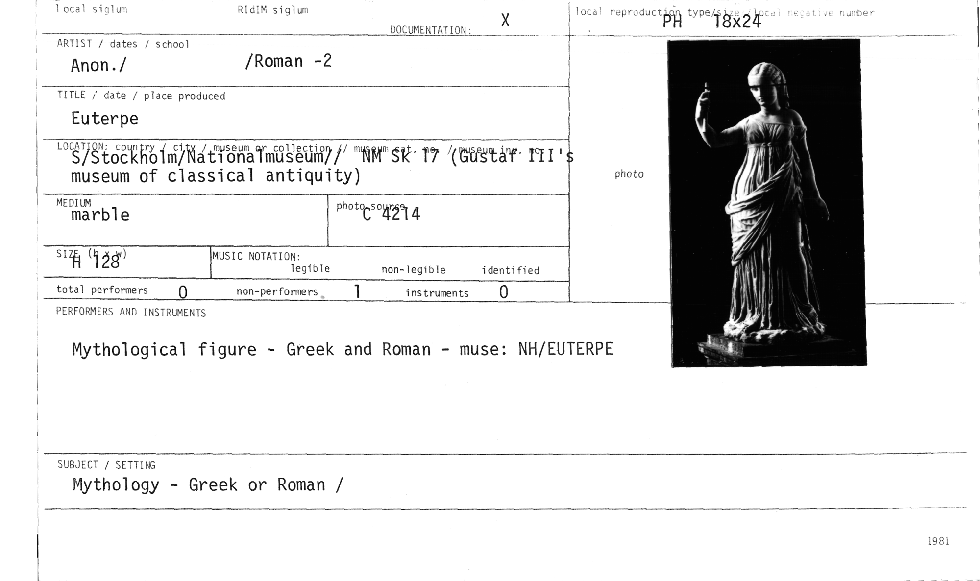 //// Anon./ //// /Roman -2 //// photo //// °(g2gUTS6"filiMkasönmairrriUgliM7/11WSk—r7 /(nbegtåY.III's museum of classical antiquity) //// MUSIC NOTATION: //// legible //// non-legible identified //// instruments 0 //// total performers o non-performers //// Tocal siglum RIdIM siglum //// DOCUMENTATION: //// x //// ARTIST / dates / school //// TITLE / date / place produced //// Euterpe //// phottso4r29.1 4 //// PERFORMERS AND INSTRUMENTS //// Mythological figure - Greek and Roman - muse: NH/EUTERPE //// MEDIUM //// marble //// izfi (1 ås) //// SUBJECT / SETTING //// Mythology - Greek or Roman / //// lotal reproducth typohttfiukcal neat:te number ////