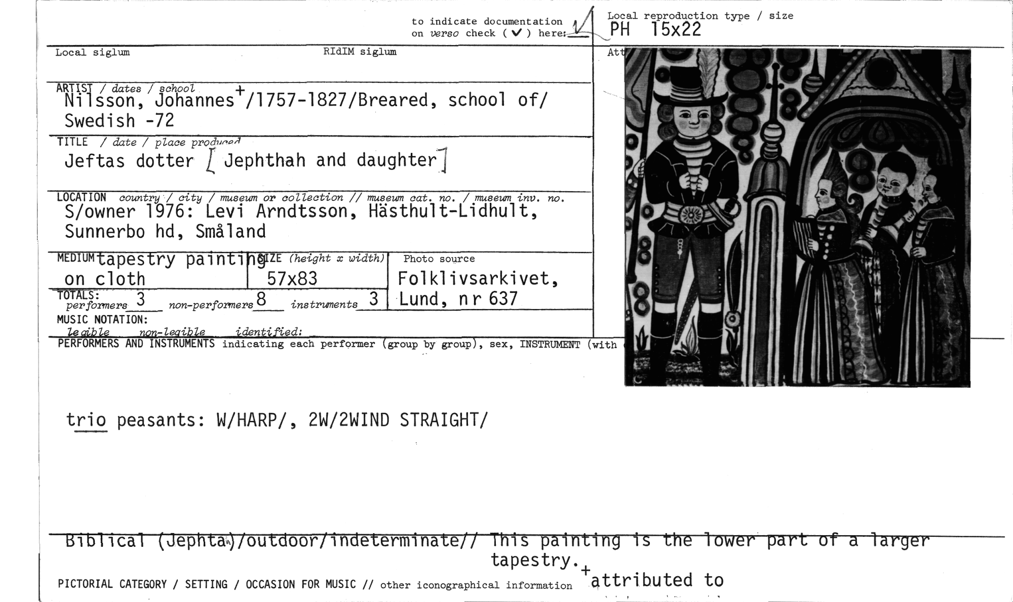//// to indicate documentation //// Local reproduction type / size //// on versa check (N.1 ) here:- ,_PH 1 5x22 //// At //// ARTIST / dates / schooZ //// Nilsson, Johannes /1757-1827/Breared, school of/ Swedish -72 //// TITLE / date / place prod,,,A //// Jeftas dotter Jephthah and daughterl //// LOCATION country / city / museum or collection // museum cat. no. / museum inv. no. //// S/owner 1976: Levi Arndtsson, Hästhult-Lidhult, Sunnerbo hd, Småland //// MEDIUM tapestry paintil IFE (height x width) Photo source //// on cloth 57x83 Folklivsarkivet, //// TÖTALS: non-performers 8 instruments 3 Lund, nr 637 //// per formers 3 //// MUSIC NOTATION: //// PERFORMERS AND INSTRUMENTS indicating each performer (group by group), sex, INSTRUMENT (with //// trio peasants: W/HARP/, 2W/2WIND STRAIGHT/ //// Local siglum //// RIdIM siglum //// ica ep as ou •oor inse ermina e 1 p i • //// tapestry.+ //// PICTORIAL CATEGORY / SETTING / OCCASION FOR MUSIC // other iconographical information attributed to //// •!"' 111. • " ////