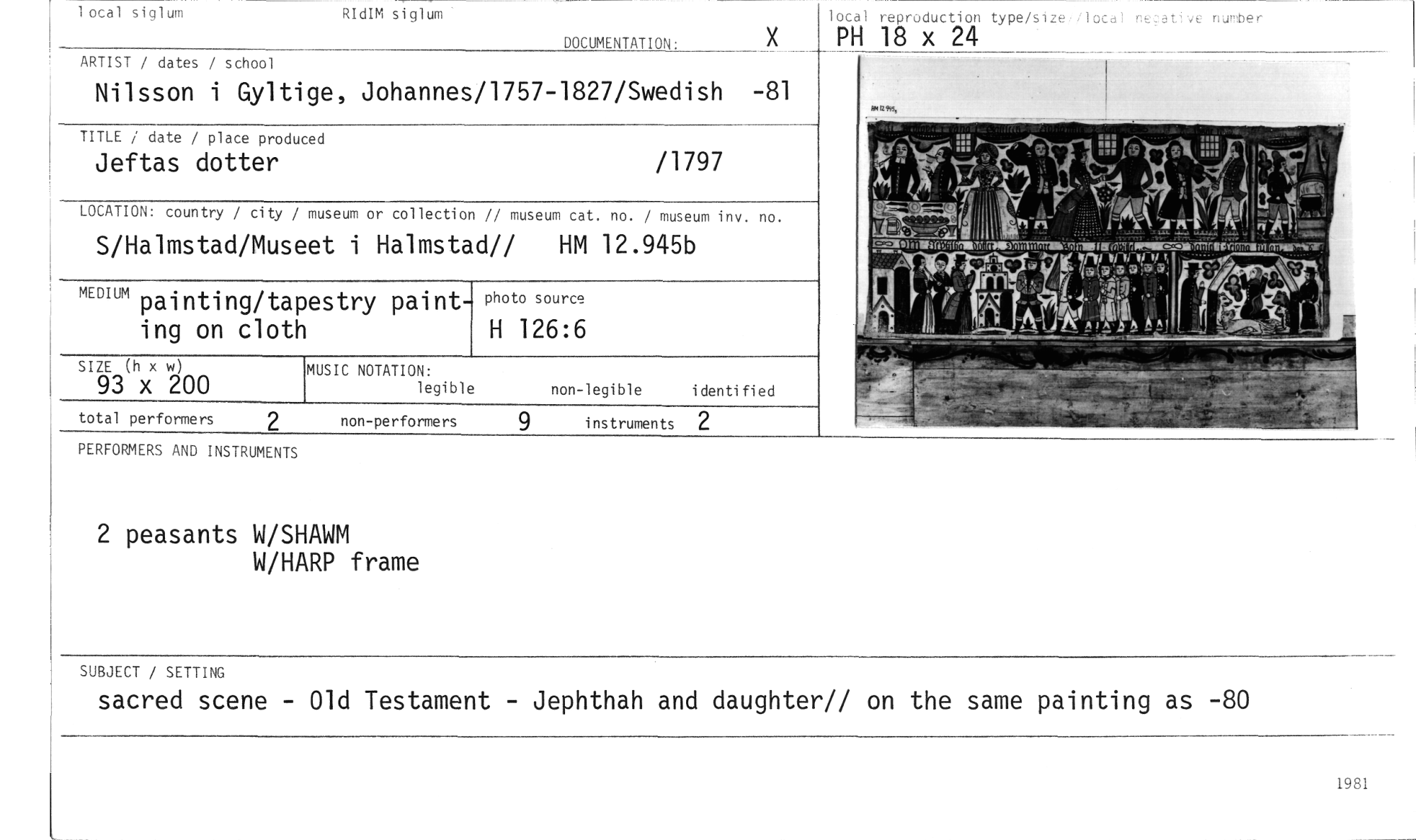 //// local siglum RIdIM siglum //// lotal reproduction type/si__ ecative number //// X PH 18 x 24 //// DOCUMENTATION: //// PERFORMERS AND INSTRUMENTS //// 2 peasants W/SHAWM //// W/HARP frame //// SUBJECT / SETTING //// sacred scene - Old Testament - Jephthah and daughter// on the same painting as -80 //// 1981 //// /1797 //// TITLE / date / place produced //// Jeftas dotter //// SIZE (h x w) //// 93 x 200 //// 9 instruments 2 //// total performers 2 //// non-performers //// museum or collection // museum cat. no. / museum inv. no. //// et i Halmstad// HM 12.945b //// S/Halmstad/Muse //// LOCATION: country / city / //// MEDIUM painting/tap ing on cloth //// estry paint- //// photo source //// H 126:6 //// MUSIC NOTATION: //// legible //// non-legible i den ti fi ed //// ARTIST / dates / school //// Nilsson i Gyltige, Johannes/1757-1827/Swedish -81 ////