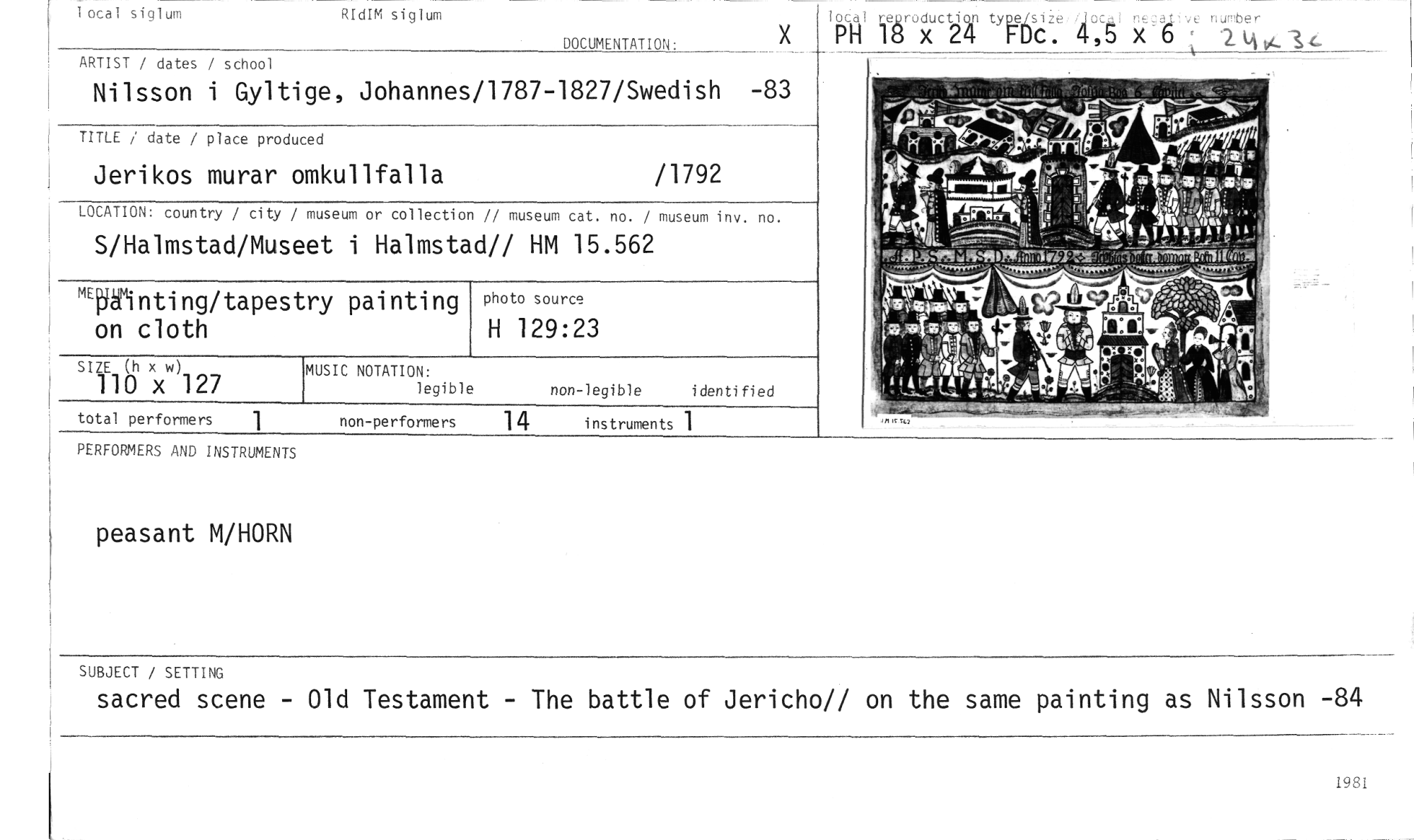 //// 1981 //// DOCUMENTATION //// Total siglum RIdIM siglum //// kcal reproductiun ty22,[size ijocAj rcak:ve nurober //// X PH 18 x 24 FOC. 4,5 X b .1 21.4 04, -14 //// ry painting //// LOCATION: country / city / //// S/Halmstad/Muse //// 9ffinting/tapest on cloth //// 1 //// total performers //// MUSIC NOTATION: //// legible //// non-legible identified //// SIZE (h x w) //// 110 x 127 //// photo source //// H 129:23 //// museum or collection // museum cat. no. / museum inv. no. //// et i Halmstad// HM 15.562 //// non-performers 14 instruments 1 //// TITLE / date / place produced //// Jerikos murar omkullfalla /1792 //// ARTIST / dates / school //// Nilsson i Gyltige, Johannes/1787-1827/Swedish -83 //// lor Via+: //// t4 A, //// ox2j //// 'FiTEMINTIPL111712841921154^79~1~- //// ggg:. //// PERFORMERS AND INSTRUMENTS //// peasant M/HORN //// SUBJECT / SETTING //// sacred scene - Old Testament - The battle of Jericho// on the same painting as Nilsson -84 ////