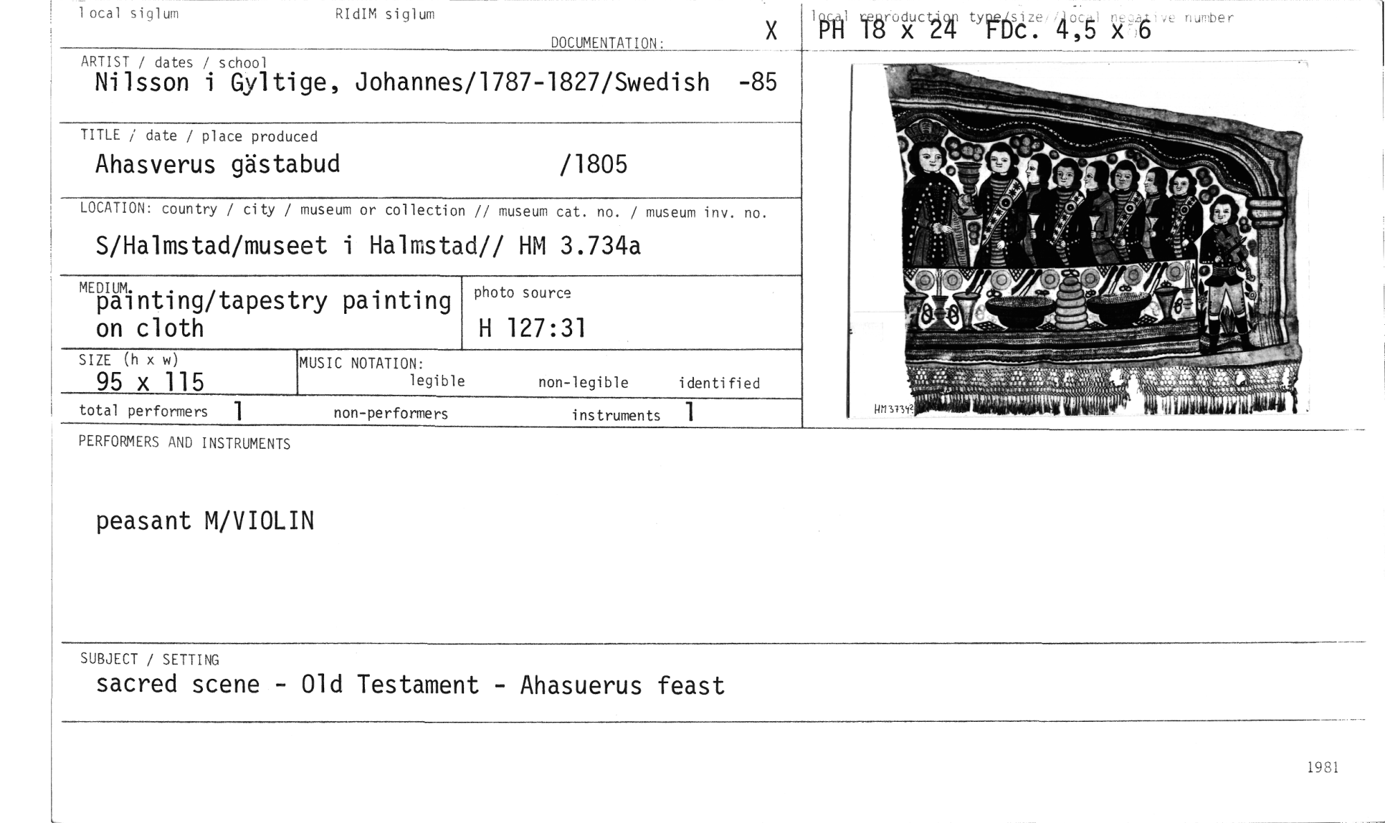 //// peasant M/VIOLIN //// /1805 //// TITLE / date / place produced //// Ahasverus gästabud //// museum or collection // museum cat. no. / museum inv. no. //// et i Halmstad// HM 3.734a //// LOCATION: country / city / //// S/Halmstad/mus //// ry painting //// MEDIUM. //// painting/tapes on cloth //// non-performers instruments 1 //// total performers 1 //// PERFORMERS AND INSTRUMENTS //// i iocal siglum RIdIM siglum //// DOCUMENTATION. //// ARTIST / dates / school //// Nilsson i Gyltige, Johannes/1787-1827/Swedish -85 //// SIZE (h x w) //// 95 x 115 //// nurober //// ,D V //// MUSIC NOTATION: //// legible non-legible identified //// photo source //// H 127:31 //// x INI leiårictf "rte //// SUBJECT / SETTING //// sacred scene - Old Testament - Ahasuerus feast //// 1981 ////