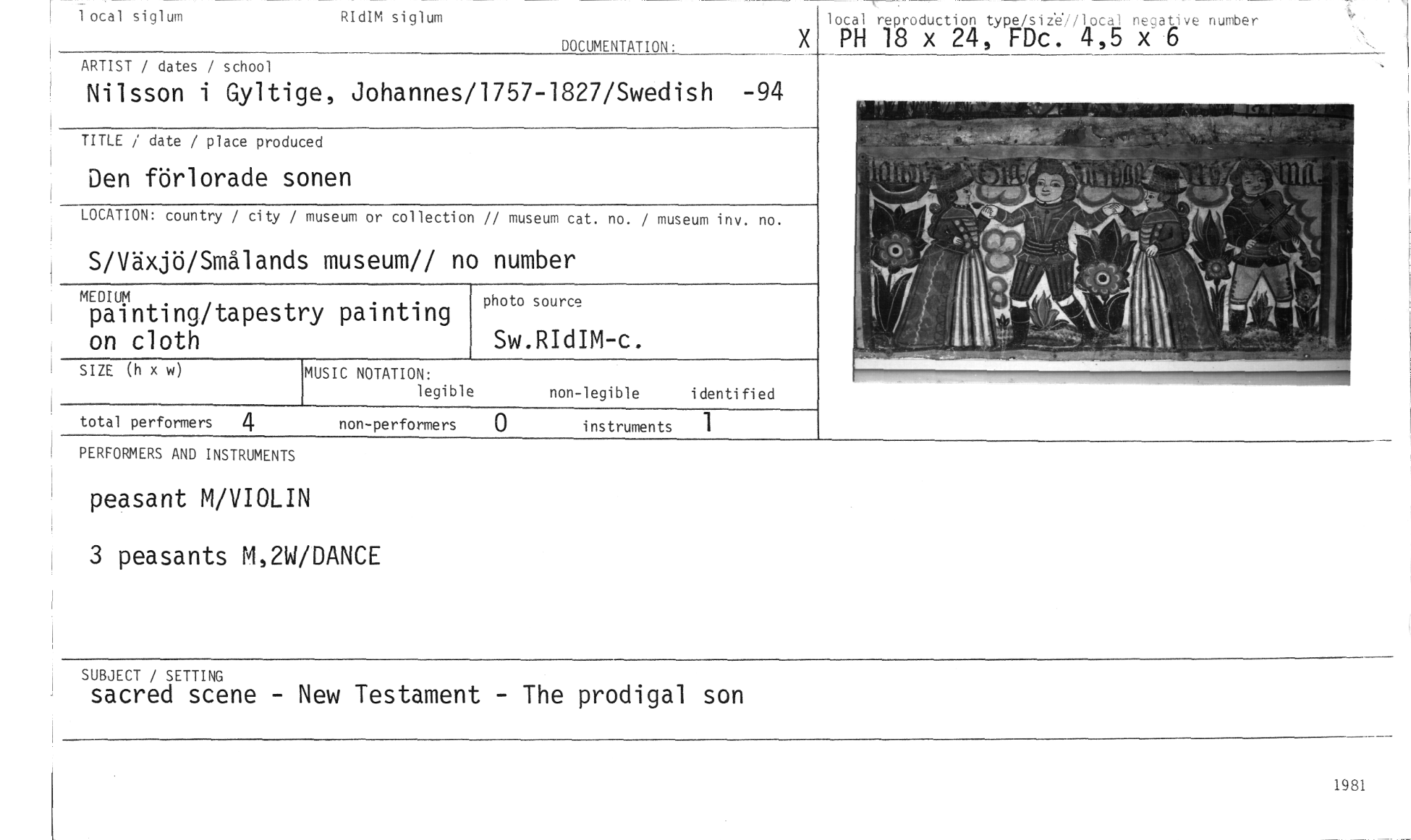 //// local reproduction type/sizb7/local negative number //// PH 18 x 24, FDc. 4,5 x 6 //// 1 1 otal siglum RIdIM siglum //// DOCUMENTATION: //// ARTIST / dates / school //// Nilsson i Gyltige, Johannes/1757-1827/Swedish -94 //// TITLE / date / place produced //// Den förlorade sonen //// LOCATION: country / city / museum or collection // museum cat. no. / museum inv. no. //// S/Växjö/Smålands museum// no number //// MEDIUM //// painting/tapestry painting on cloth //// MUSIC NOTATION: //// legible non-legible identified //// photo source //// Sw.RIdIM-c. //// SIZE (h x w) //// total performers 4 non-performers instruments 1 //// PERFORMERS AND INSTRUMENTS //// peasant M/VIOLIN //// 3 peasants M,2W/DANCE //// SUBJECT / SETTING //// sacred scene - New Testament - The prodigal son //// 1981 ////