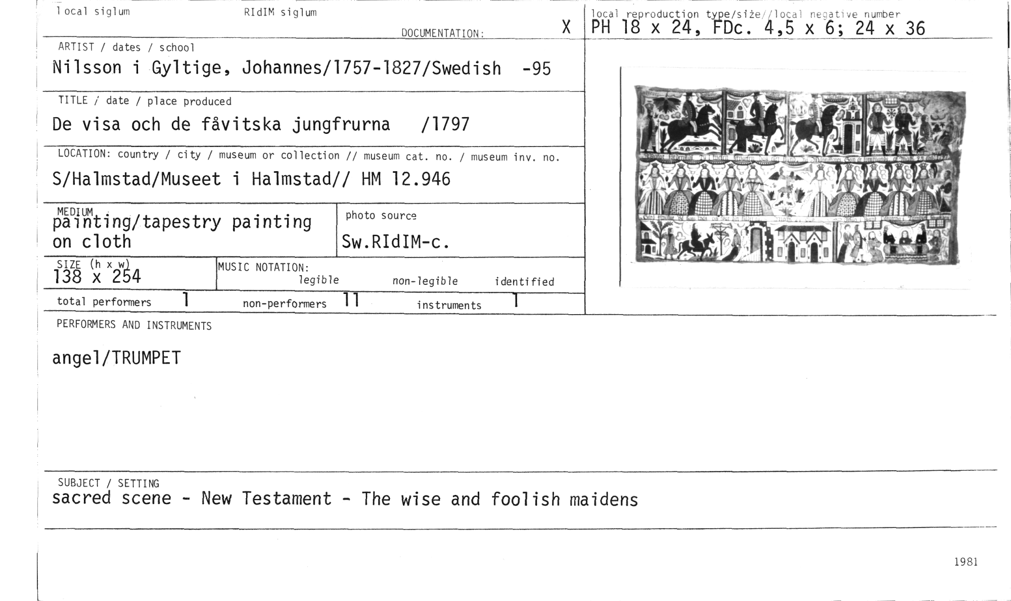//// local siglum RIdIM siglum //// DOCUMENTATION: //// ARTIST / dates / school //// Nilsson i Gyltige, Johannes/1757-1827/Swedish -95 //// TITLE / date / place produced //// De visa och de fåvitska jungfrurna /1797 //// LOCATION: country / city / museum or collection // museum cat. no. / museum inv. no. //// S/Halmstad/Museet i Halmstad// HM 12.946 //// MEDIUM //// painting/tapestry painting on cloth //// MUSIC NOTATION: //// legible non-legible identified Ki lotal äproxdu t b/cs i," e /4.1,oga 1 xnegative ; 2n4i. xmbe r 36 //// gV i //// .raerm anaffeeeramou, //// ormiatij4Immbiidmulrm //// i li Ii , //// I .41 //// photo source //// Sw.RIdIM-c. //// SIZE (h x w.) //// 138 x 254 //// total performers non-performers 1 1 instruments 1 //// PERFORMERS AND INSTRUMENTS //// angel/TRUMPET //// SUBJECT / SETTING //// sacred scene - New Testament - The wise and foolish maidens //// 1981 ////