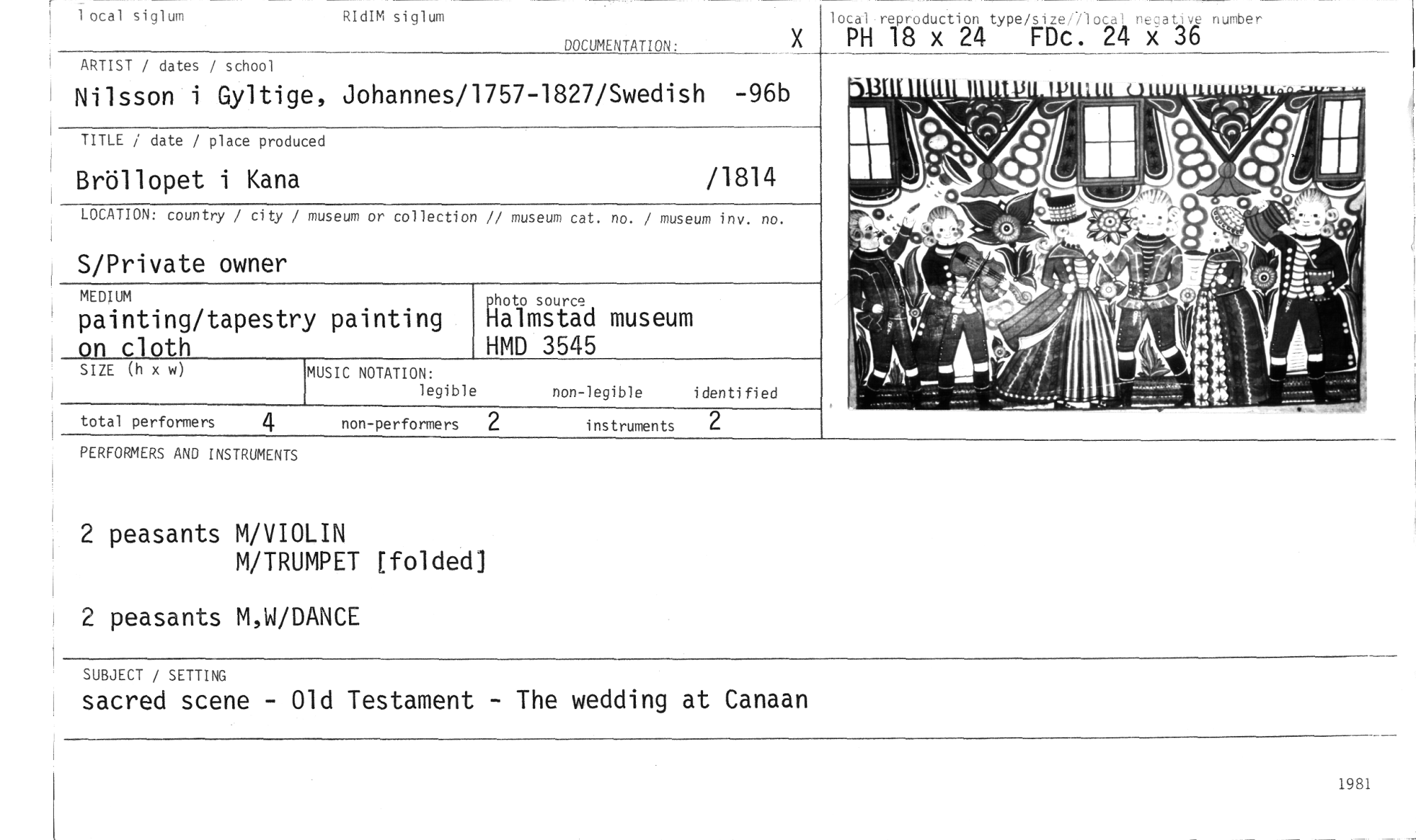 //// 2 peasants M/VIOLIN //// M/TRUMPET (folded] //// 2 peasants M,W/DANCE //// SUBJECT / SETTING //// sacred scene - Old Testament - The wedding at Canaan //// 1981 //// RIdIM siglum //// 1 ocal siglum //// DOCUMENTATION: //// 2 //// instruments //// lotal reproduction type/size//local neave number //// PH 18 x 24 FDc. 24 x 36 //// ARTIST / dates / school //// Nilsson i Gyltige, Johannes/1757-1827/Swedish -96b //// TITLE / date / place produced //// Bröllopet i Kana /1814 //// LOCATION: country / city / museum or collection // museum cat. no. / museum inv. no. //// S/Private owner //// MEDIUM //// painting/tapestry painting on cloth //// SIZE (h x w) //// MUSIC NOTATION: //// legible //// non-legible identified //// total performers //// PERFORMERS AND INSTRUMENTS //// non-performers ////