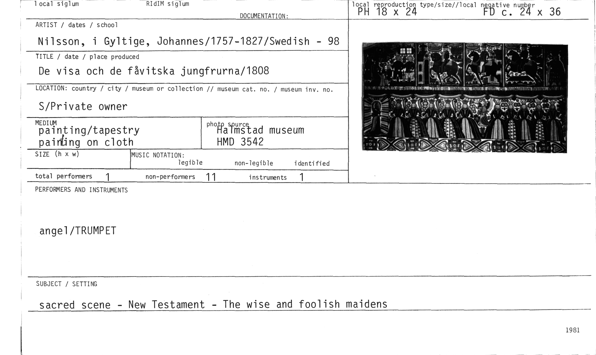 //// 1 ocal siglum RIdIM siglum //// local reproduction type/size//local negative number //// PH 18 x 24 ED c. 24 x 36 //// DOCUMENTATION: //// ARTIST / dates / school //// Nilsson, i Gyltige, Johannes/1757-1827/Swedish - 98 //// TITLE / date / place produced //// De visa och de fåvitska jungfrurna/1808 //// LOCATION: country / city / museum or collection // museum cat. no. / museum inv. no. //// S/Private owner //// MEDIUM //// painting/tapestry painhng on cloth //// MUSIC NOTATION: //// legible non-legible identified //// total performers 1 non-performers 1 1 instruments //// PERFORMERS AND INSTRUMENTS //// °Wasfffiad museum HMD 3542 //// SIZE (h x w) //// ... 4; //// r //// fffilälIlCllnMTMTTtfin, //// angel/TRUMPET //// SUBJECT / SETTING //// sacred scene - New Testament - The wire and foolish maidens //// 1981 ////