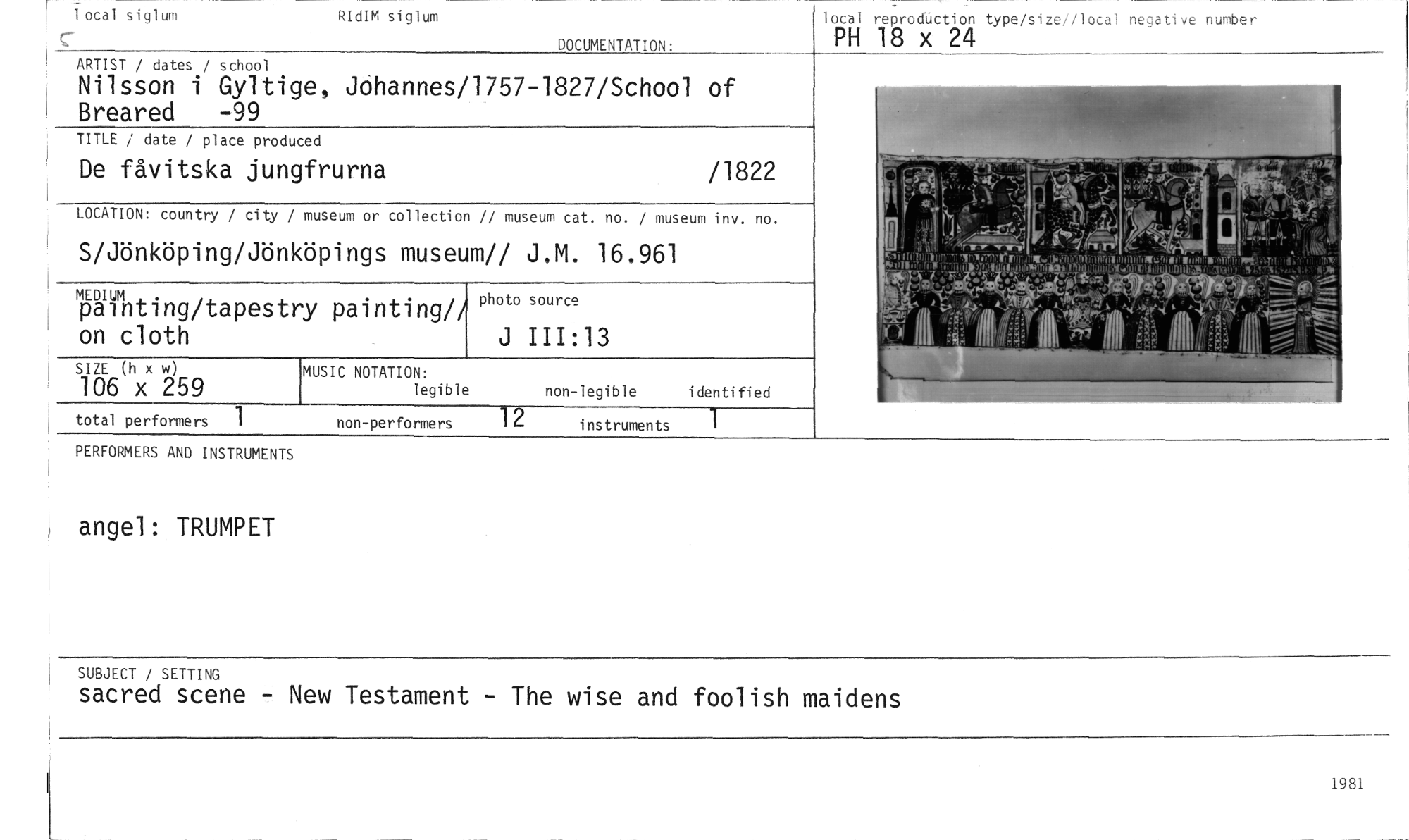 //// r - //// 1 lotal siglum //// c //// ARTIST / dates / school //// Nilsson i Gyltige, Jähannes/1757-1827/School of Breared -99 //// TITLE / date / place produced //// De fåvitska jungfrurna /1822 //// MEDIUM //// painting/tapestry painting// on cloth //// lotal reprofiction type/size local neu,ative number //// PH 18 x 24 //// Na, //// RIdIM siglum //// DOCUMENTATION: //// LOCATION: country / city / museum or collection // museum cat. no. / museum inv. no. //// S/Jönköping/Jönköpings museum// J.M. 16.961 //// photo source //// J 111:13 //// siÖ (h x w) l6 x 259 !MUSIC NOTATION: non-legible identified //// legible //// //// total performers non-performers 12 instruments //// PERFORMERS AND INSTRUMENTS //// angel: TRUMPET //// SUBJECT / SETTING //// sacred scene - New Testament - The wise and foolish maidens //// 1981 ////