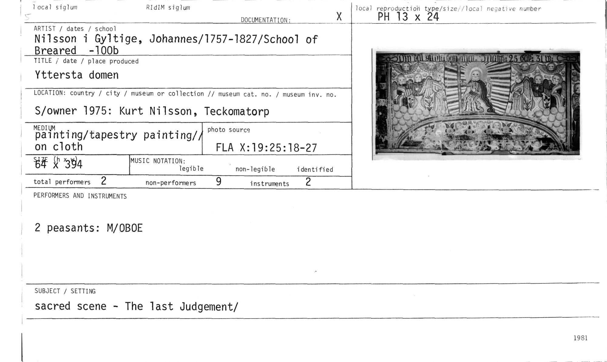 //// lotal siglum //// RIdIM siglum //// DOCUMENTATION: //// lotal reproductioh type/size//local negative number //// PH 13 x 24 //// ARTIST / dates / school //// Nilsson i Gyltige, Johannes/1757-1827/School of //// Breared -100b //// TITLE / date / place produced //// Yttersta domen //// LOCATION: country / city / museum or collection // museum cat. no. / museum inv. no. //// S/owner 1975: Kurt Nilsson, Teckomatorp //// mEmum . //// painting/tapestry painting// //// on cloth //// tif //// total performers 2 non-performers 9 instruments 2 //// photo source //// FLA X:19:25:18-27 //// MUSIC NOTATION: //// legible non-legible identified //// PERFORIIERS AND INSTRUMENTS //// 2 peasants: M/OBOE //// SUBJECT / SETTING //// sacred scene - The last Judgement/ //// 1981 ////