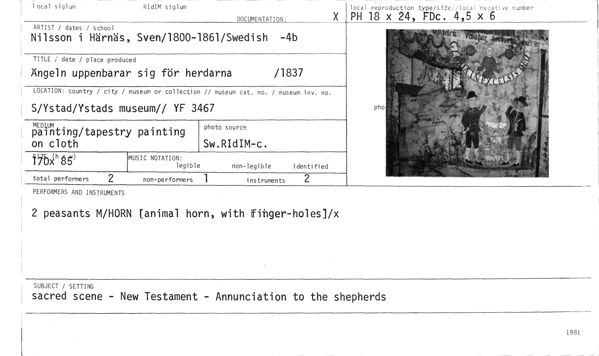//// local reproduction type/sile//local 'negative number //// PH 18 x 24, FDc. 4,5 x 6 //// local siglum RIdIM siglum //// DOCUMENTATION• //// ARTIST / dates / school //// Nilsson i Härnäs, Sven/1800-1861/Swedish -4b //// TITLE / date / place produced //// Ängeln uppenbarar sig för herdarna /1837 //// LOCATION: country / city / museum or collection // museum cat. no. / museum inv. no. //// S/Ystad/Ystads museum// YF 3467 //// MEDWM //// painting/tapestry painting on cloth //// InAhåg) //// total performers 2 non-performers 1 instruments 2 //// X //// MUSIC NOTATION: //// legible non-legible identified //// photo source //// Sw.RIdIM-c. //// PERFORMERS AND INSTRUMENTS //// 2 peasants M/HORN [animal horn, with fifiger-holes1/x //// SUBJECT / SETTING //// sacred scene - New Testament - Annunciation to the shepherds //// 1981 ////