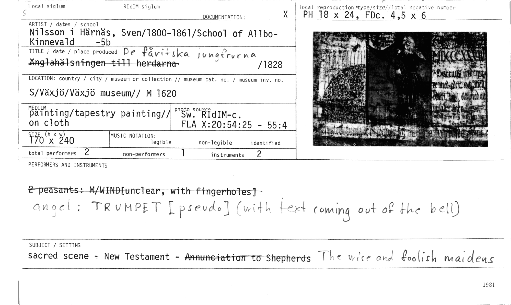 //// local siglum RIdIM siglum DOCUMENTATION• //// S //// ARTIST / dates / school //// Nilsson i Härnäs, Sven/1800-1861/School of AllboKinnevald -5b //// TITLE / date / place produced D e gv^ r -sket //// ju v ru r //// //// /1828 //// //// LOCATION: country / city / museum or collection // museum cat. no. / museum inv. no. //// S/Växjö/Växjö museum!! M 1620 //// MEDIUM //// painting/tapestry painting// Phg:"CdIM-c. //// on cloth FLA X:20:54:25 - 55:4 //// sfYo'hxx 2)40 MUSIC NOTATION: non-legible identified //// legible //// //// //// //// local reprodUction,type/stte//loral negative number //// PH 18 x 24, FDc. 4,5 x 6 //// total performers 2 non-performers 1 instruments 2 //// PERFORMERS AND INSTRUMENTS //// e—pra-sant-s-:—M/44-1-N-EFEtnictear-, with finger holesj- //// ekvir)( i T R v KIPET uSeuo(03 (wi4-k lowoy13 u4-- c;^ (fln lo et0 //// SUBJECT / SETTING //// sacred scene - New Testament - Aftlierreiettan—ra S trepfierds km_ vt,('re andKg0.5((.6 vk at i eitS //// 1981 ////
