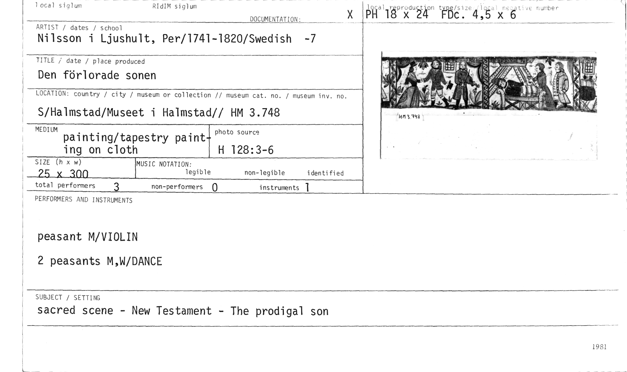 //// 1 ocal siglum //// RIdIM siglum //// DOCUMENTATION: //// gal,rAprodu9,..t.lon ty.Rxzeii //// x 44 r . eyative //// unib e //// ARTIST / dates / school //// Nilsson i Ljushult, Per/1741-1820/Swedish -7 //// TITLE / date / place produced //// Den förlorade sonen //// LOCATION: country / city / museum or collection // museum cat. no. / museum inv. no. //// S/Halmstad/Museet i Halmstad!! HM 3.748 //// '1-1^11-018 //// MEDIUM //// painting/tapestry painting on cloth //// SIZE (h x w) //// 25 x 30n //// MUSIC NOTATION: //// legible //// non-legible i denti fi ed //// total performers 3 //// instruments 1 //// non-performers 0 //// PERFORMERS AND INSTRUMENTS //// peasant M/VIOLIN //// 2 peasants M,W/DANCE //// SUBJECT / SETTING //// sacred scene - New Testament - The prodigal son //// 1981 ////