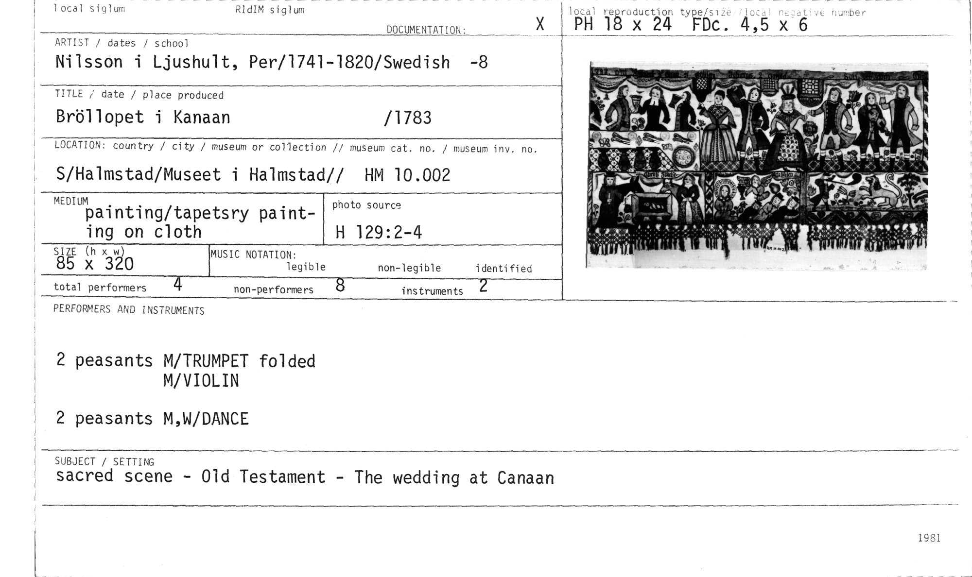 //// local siglum RIdIM siglum //// DOCUMENTATION: //// I ckil 1årodxuctio41 tyg6sci ie... i4loc.-61 nxeaåci ve n urnbe //// ARTIST / dates / school //// Nilsson i Ljushult, Per/1741-1820/Swedish -8 //// TITLE date / place produced //// Bröllopet i Kanaan /1783 //// LOCATION: country / city / museum or collection // museum cat. no. / museum inv. no. //// S/Halmstad/Museet i Halmstad// HM 10.002 //// MEDIUM //// painting/tapetsry painting on cloth //// MUSIC NOTATION: //// legible non-legible identified //// non-performers 8 instruments 2 //// SIZE (h x w) //// 85 x 320 //// total performers 4 //// photo source //// H 129:2-4 //// PERFORMERS AND INSTRUMENTS //// 2 peasants M/TRUMPET folded //// M/VIOLIN //// 2 peasants M,W/DANCE //// SUBJECT / SETTING //// sacred scene - Old Testament - The wedding at Canaan //// 19S1 ////