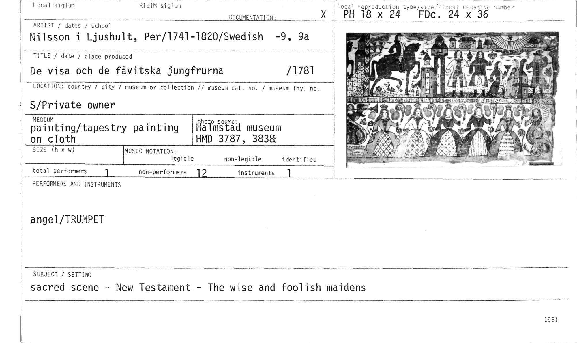 //// PERFORMERS AND INSTRUMENTS //// angel/TRUlPET //// SUBJECT / SETTING //// sacred scene - New Testament - The wise and foolish maidens //// 1 //// total performers 1 //// non-performers 12 //// instruments //// MUSIC NOTATION: //// legible //// non-legible identified //// 1 ocal siglum RIdIM siglum //// DOCUMENTATION: //// ARTIST / dates / school //// Nilsson i Ljushult, Per/1741-1820/Swedish -9, 9a //// TITLE I date / place produced //// De visa och de fåvitska jungfrurna /1781 //// LOCATION: country / city / museum or collection // museum cat. no. / museum inv. no. //// S/Private owner //// MEDIUM //// painting/tapestry painting on cloth //// SIZE (h x w) //// gYMkad museum HMD 3787, 3838E //// X //// local r 18x eproducio4 //// tn type/ FDc.2 sjze'llocal nega36 tive nurober //// PH 2 4 x //// 1981 ////