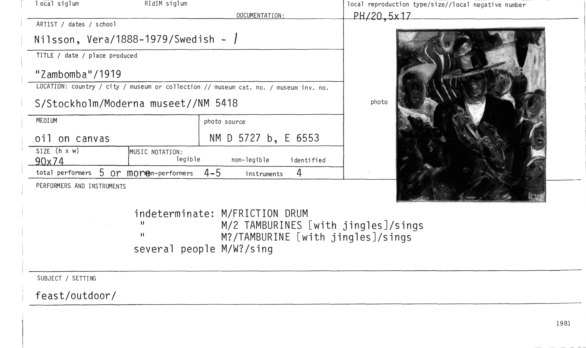 //// local reproduction type/size//local negative number //// PH/20, 5412 //// local siglum RIdIM siglum //// DOCUMENTATION: //// ARTIST / dates / school //// Nilsson, Vera/1888-1979/Swedish - //// TITLE / date / place produced //// "Zambomba"/1919 //// LOCATION: country / city / museum or collection // museum cat. no. / museum inv. no. //// S/Stockholm/Moderna museet//NM 5418 //// MEDIUM //// oil on canvas //// SIZE (h x w) //// 90x74 //// total performers 5 or mo rDn-performers 4-5 instruments 4 //// PERFORMERS AND INSTRUMENTS //// MUSIC NOTATION: //// legible non-legible identified //// photo source //// NM D 5727 b, E 6553 //// photo //// indeterminate: M/FRICTION DRUM //// M/2 TAMBURINES [with jingles]/sings M?/TAMBURINE [with jinglesi/sings several people M/W?/sing //// SUBJECT / SETTING //// feast/outdoor/ //// 1981 ////
