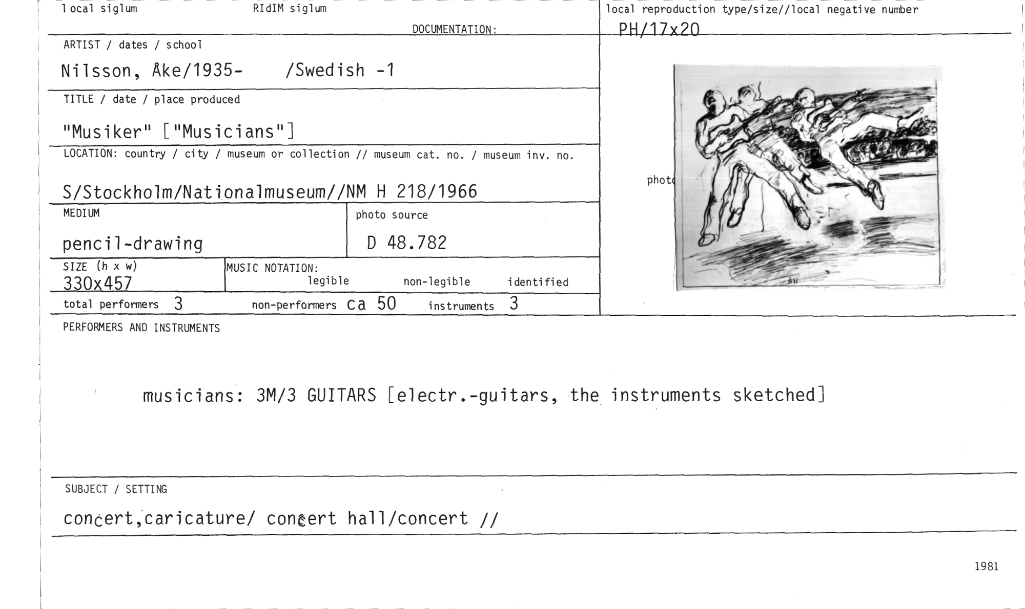 //// 1 ocal siglum RIdIM siglum //// DOCUMENTATION: //// local reproduction type/size//local negative number //// PH/17y20 //// ARTIST / dates / school //// Nilsson, Åke/1935- /Swedish -1 //// TITLE / date / place produced //// "Musiker" ["Musicians"] //// LOCATION: country / city / museum or collection // museum cat. no. / museum inv. no. //// S/Stockholm/Nationalmuseum//NM H 218/1966 //// MEDIUM //// pencil-drawing //// SIZE (h x w) //// 330x457 //// total performers 3 non-performers Ca 50 instruments 3 //// photo source //// D 48.782 //// MUSIC NOTATION: //// legible non-legible identified //// phot //// PERFORMERS AND INSTRUMENTS //// musicians: 3M/3 GUITARS [electr.-guitars, the instruments sketched] //// SUBJECT / SETTING //// contert,caricature/ coneert hall/concert 1/ //// 1981 ////