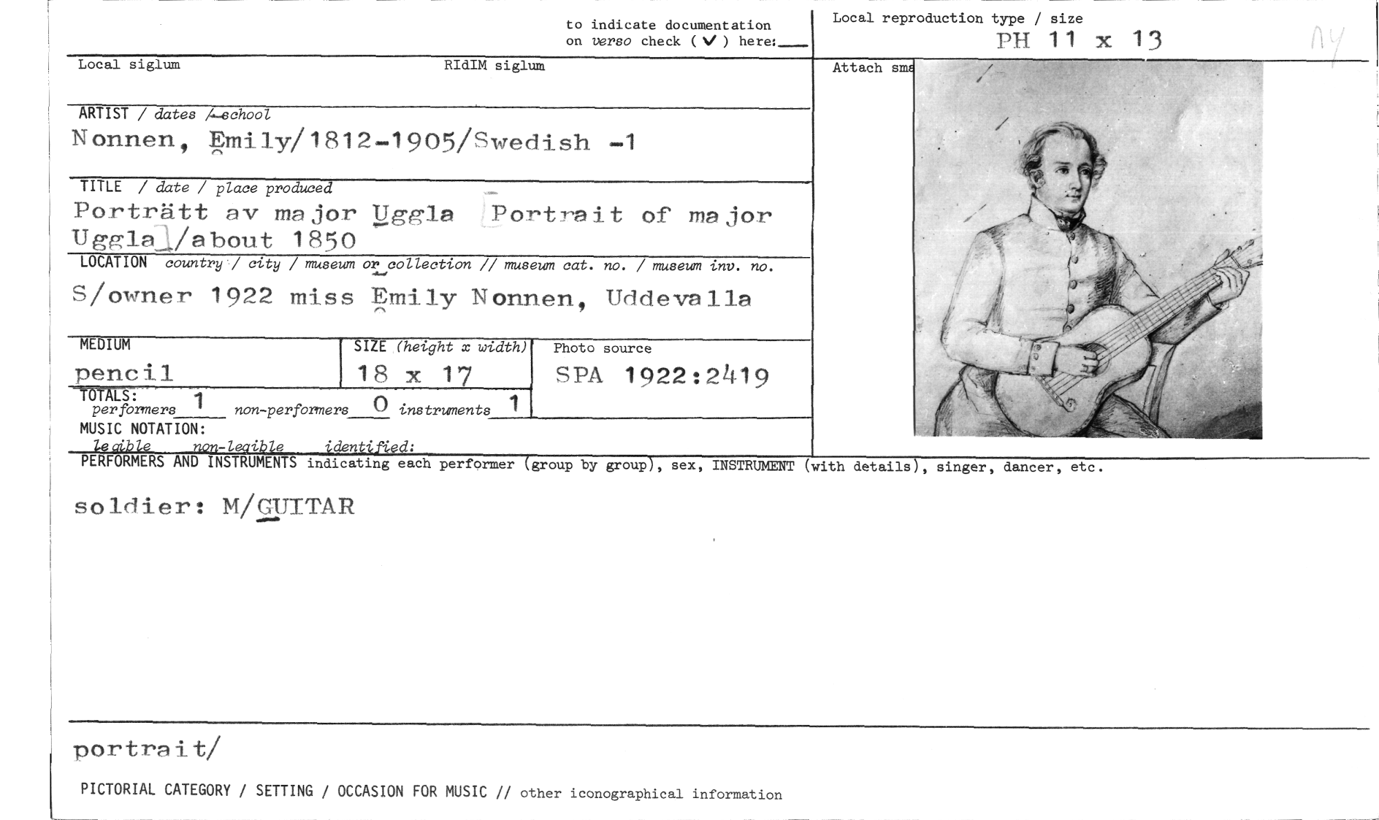 //// to indicate documentation //// on verso check (NI ) here:_ //// Local reproduction type / size //// PH 11 x 1 //// Local siglum //// RIdIM siglum //// Attach snik //// ARTIST / datea •school //// Nonnen, Emily/1812-1905/Swedish -1 //// TITLE / date / place produced //// Porträtt av major Uggla Portrait of major //// Ugglajabout 1850 //// LOCATION country / city / museum or collection // museum cat. no. / museum inv. no. //// S/owner 1922 miss Fmily Nonnen, Uddevalla //// SIZE (height x width) //// 18 x 17 //// MUSIC NOTATION: //// lsable non-lecible identifled: //// PERFORMERS AND INSTRUMENTS indicating each performer (group by group), sex, INSTRUMENT //// soldier: M/GUTTAR //// —WALS: //// perfbrmers 1 non-perfbrmers 0 instruments //// MEDIUM //// pencil //// Photo source //// SPA 1922:2419 //// (with details , singer, dancer, etc. //// portrait/ //// PICTORIAL CATEGORY / SETTING / OCCASION FOR MUSIC // other iconographical information ////