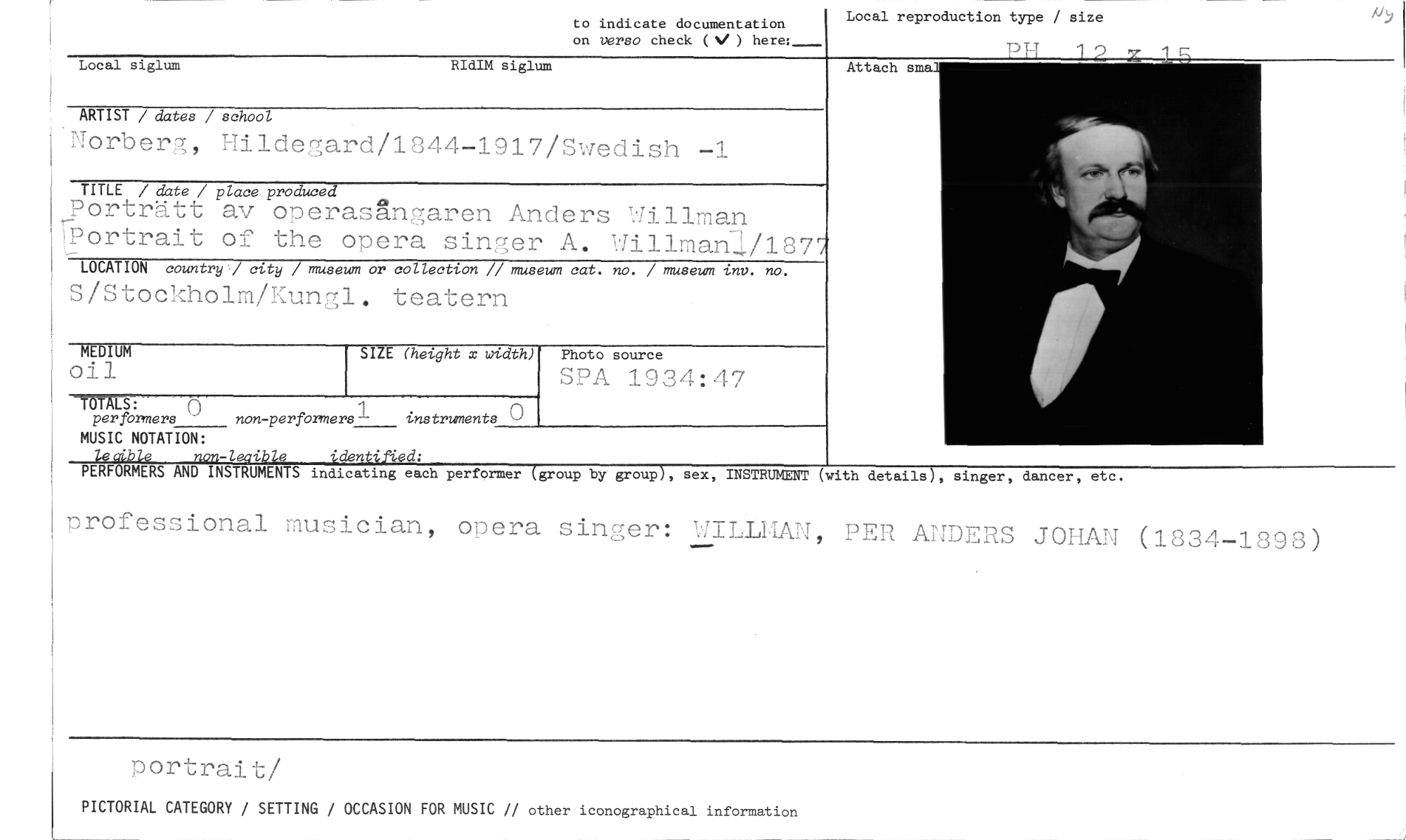 //// Local reproduction type / size //// to indicate documentation //// on verso check ( ) here:_ //// Local siglum RIdIM siglum //// ARTIST / dates / school //// Norberg, Hildegard/1844-1917/Swedish //// TITLE / date / place produced //// Porträtt av operasångaren Anders Willman rPortrait of the opera singer A. Willman-1./1875 //// LOCATION country,/ city / museum or collection // museum cat. no. / museum inv. no. //// S/Stockholm/Kungl. teatern //// MEDIUM //// TOTALS: //// per formers non-per formers1 //// MUSIC NOTATION: //// e "den //// SIZE (height x width) //// instruments //// Photo source //// SPA 1934:47 //// Attach s //// PERFORMERS AND INSTRUMENT indicating each performer group by group , sex, INSTRUMENT (with details , singer, dancer, etc. //// professional musician, opera singer: =MAN, PER ANDERS JOHAN (1834-1898) //// portrait/ //// PICTORIAL CATEGORY / SETTING / OCCASION FOR MUSIC // other iconographical information ////