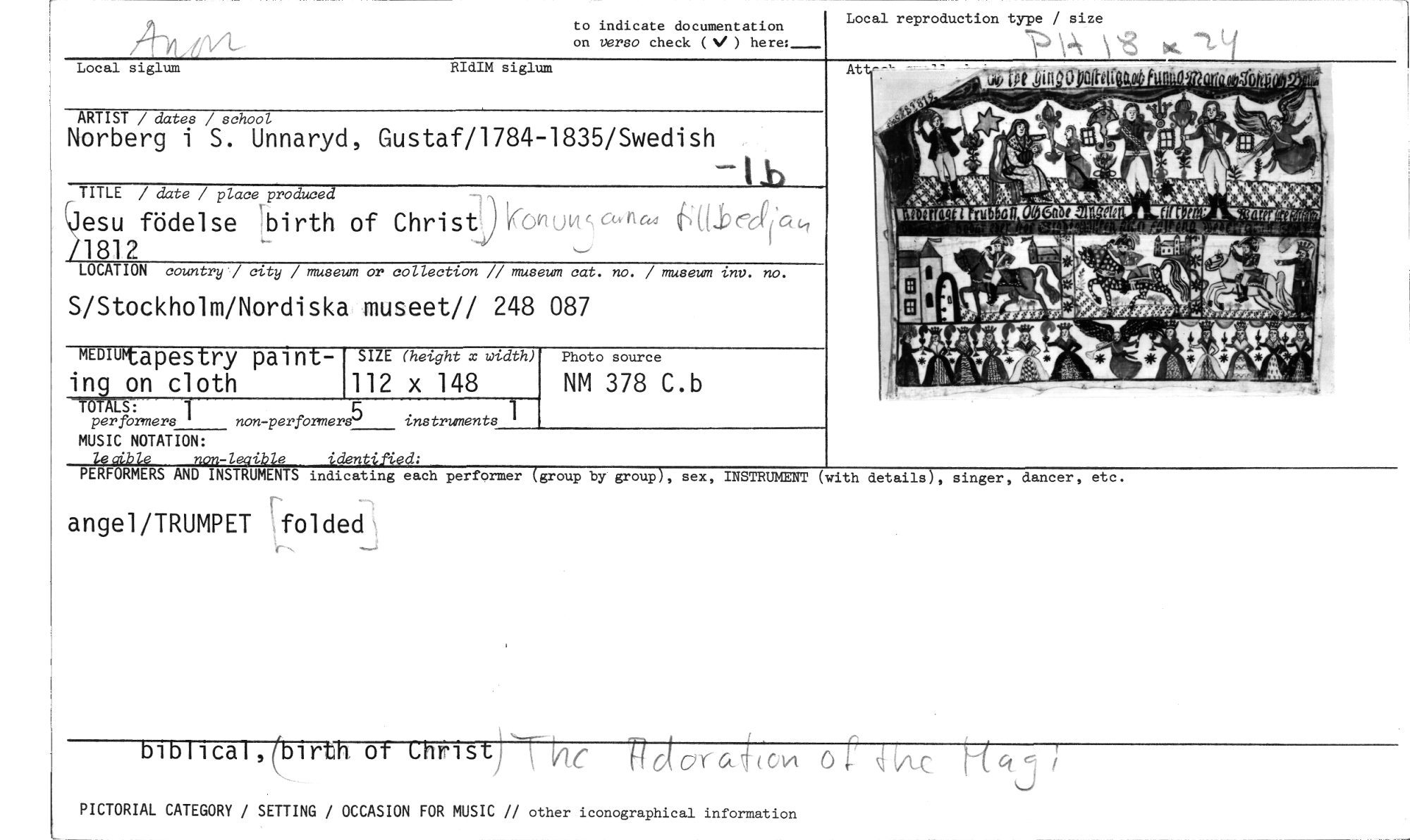 //// Local reproduction type / size //// I r( //// tel //// ***La. , * //// rumarilialnit5WARTffl. i //// to indicate documentation on verso check (N/ ) here: //// Local siglum RIdIM siglum //// ARTIST / dates / school //// Norberg i S. Unnaryd, Gustaf/1784-1835/Swedish //// TITLE / date / place produced //// ir //// .esu födelse 'birth of Christ: ykönu145cA/310, ht.t //// lect(ai //// 1812 //// LOCATION country / city / museum or collection // museum cat. no. / museum inv. no. //// S/Stockholm/Nordiska museet// 248 087 //// MEDIUbt apestry paint- //// ing on cloth TOTAS: //// per formers 1 non-performers5 instruments 1 //// SIZE (height x width) //// 112 x 148 //// Photo source //// NM 378 C.b //// MUSIC NOTATION: //// Lectible non-leaible identified: //// PERFORMERS AND INSTRUMENTS indicating each performer (group by group), sex, //// angel/TRUMPET folded //// INSTRUMENT (with details), singer, dancer, etc. //// biblicai, birtn ot Lnrist //// or (614 0 4 (Ac. ct j //// PICTORIAL CATEGORY / SETTING / OCCASION FOR MUSIC // other iconographical information ////