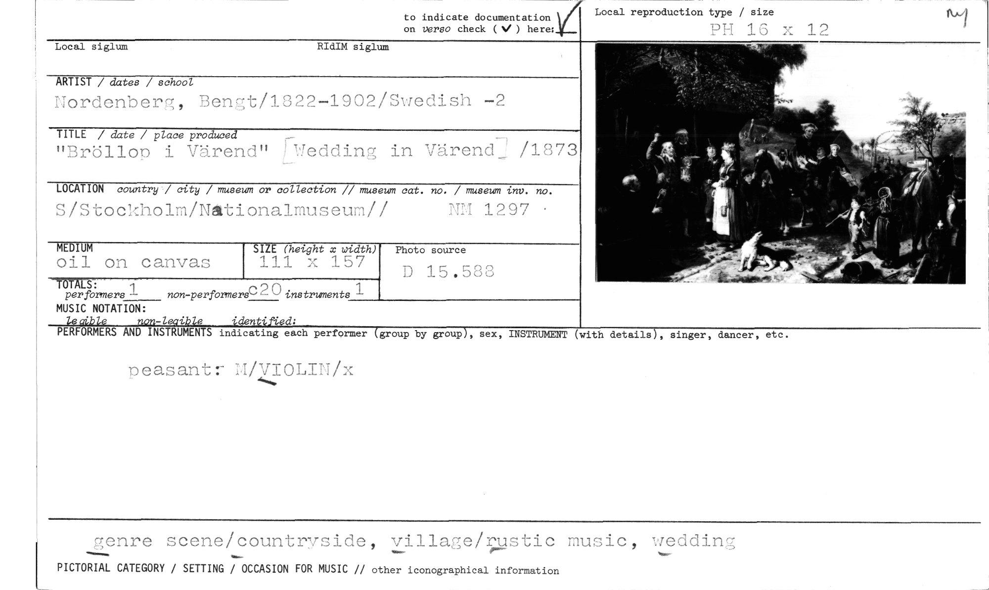 //// to indicate documentation //// on versa check (N/ ) here: //// Local reproduction type / size //// PH 15 x 12 //// Local siglum RIdIM siglum //// ARTIST / date: / school //// Nordenberg, Bengt/1822-1902/Swedish -2 //// 7=7737;7=M3,72 //// "Bröllop i Värend" FUedding in Värend2 /1873 //// LOCATION country >/ city / museum or collection // museum cat. no. / museum inv. no. //// S/Stockholm/Nditionalmuseum// NI 1297 • //// MEDIUM //// oil on canvas -TTREr //// per formers i non-performers(320instruments //// MUSIC NOTATION: //// leaible non-leoible identified: //// PERFORMERS AND INSTRUMENTS indicating each performer (group by //// neasant: M/VIOLIN/x //// genre scene/countryside, villaYe/rustic music, wedding //// P"'" //// •^•••^ //// PICTORIAL CATEGORY / SETTING / OCCASION FOR MUSIC // other iconographical information //// SIZE (height x width) //// 111 x 157 //// Photo source //// D 15.588 //// group), sex, INSTRUMENT (with details), singer, dancer, etc. ////