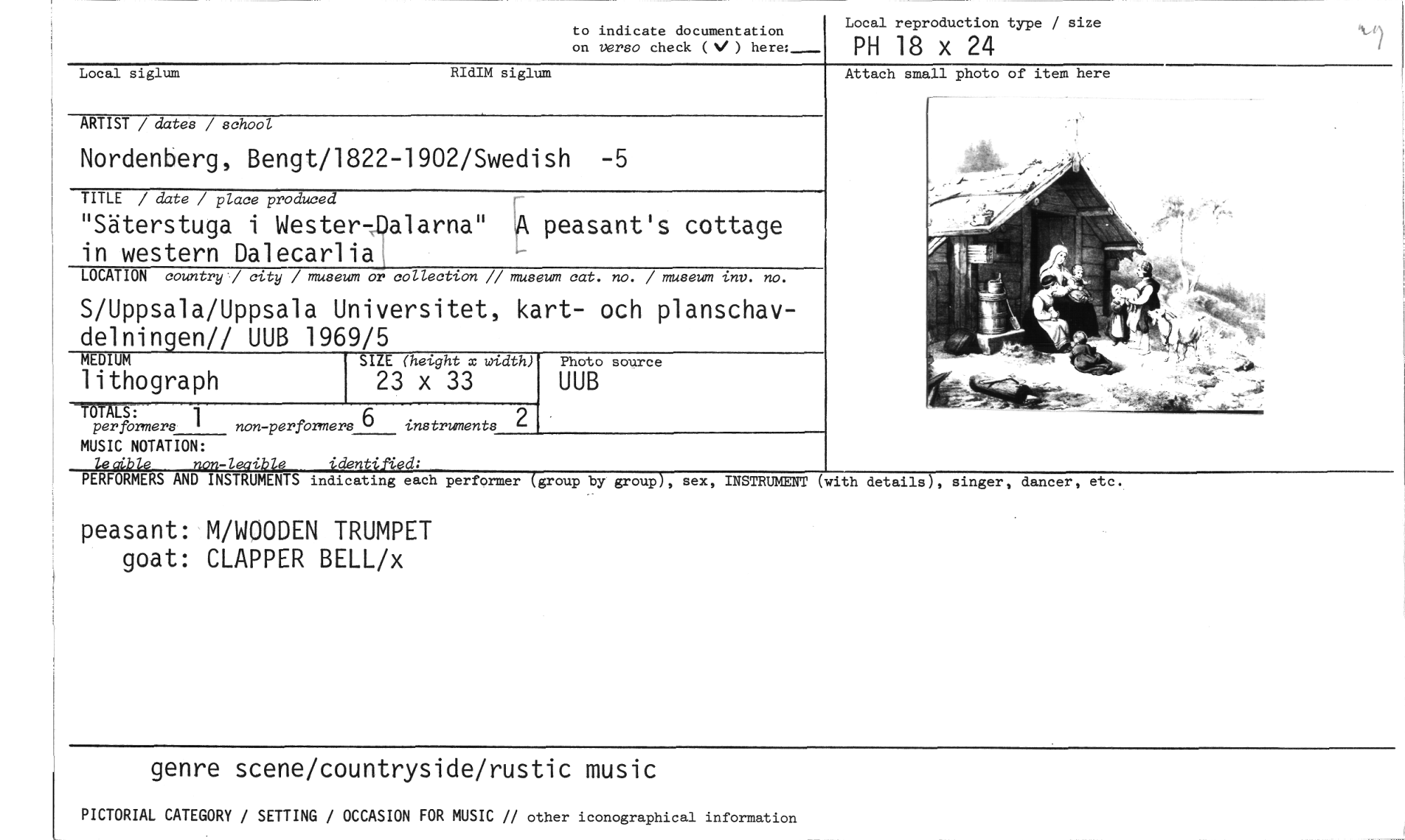 //// to indicate documentation //// on verso check ( I ) here:_ //// Local reproduction type / size //// PH 18 x 24 //// Local siglum RIdIM siglum //// Attach small photo of item here //// ARTIST / dates / school //// Nordenberg, Bengt/1822-1902/Swedish -5 //// TITLE / date / place produced //// "Säterstuga i Wester-Dalarna" A peasant's cottage //// in western Dalecarlia, //// LOCATION country ./ city / museum or collection // museum cat. no. / museum inv. no. //// S/Uppsala/Uppsala Universitet, kart- och planschavdelningen// UUB 1969/5 //// MEDIUM SIZE (height x width) //// lithograph 23 x 33 //// -TÖTALS: //// 1 //// per formers non -perfbrmers 6 instruments 2 //// MUSIC NOTATION: //// lecible non-legible identified: //// PERFORMERS AND INSTRUMENTS indicating each performer (group by group), sex, INSTRUMENT (with details), singer, dancer, etc. //// peasant: M/WOODEN TRUMPET //// goat: CLAPPER BELL/x //// Photo source //// UUB //// genre scene/countryside/rustic music //// PICTORIAL CATEGORY / SETTING / OCCASION FOR MUSIC // other iconographical information ////