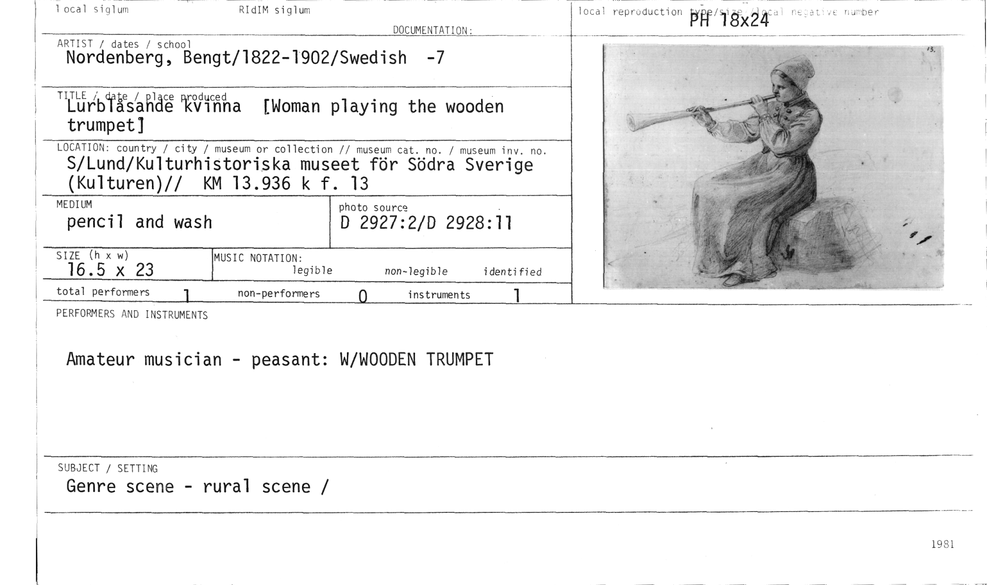 //// Amateur musician - peasant: W/WOODEN TRUMPET //// 1 ocal siglum RIdIM siglum //// DOCUMENTATION: //// ARTIST / dates / school //// Nordenberg, Bengt/1822-1902/Swedish -7 //// TILUr~au'ONla [Woman playing the wooden //// trumpet] //// LOCATION: country / city / museum or collection // museum cat. no. / museum inv. no. //// S/Lund/Kulturhistoriska museet för Södra Sverige (Kulturen)// KM 13.936 k f. 13 //// MEDIUM photo source //// pencil and wash D 2927:2/D 2928:11 //// local reproduction typr/sik,4.49ical ne;at,ve number //// I OXCL1 //// '3. //// SIZE (h x w) MUSIC NOTATION: //// 16.5 x 23 legible non-legible identified //// instruments 1 //// PERFORMERS AND INSTRUMENTS //// SUBJECT / SETTING //// Genre scene - rural scene / //// 1081 ////
