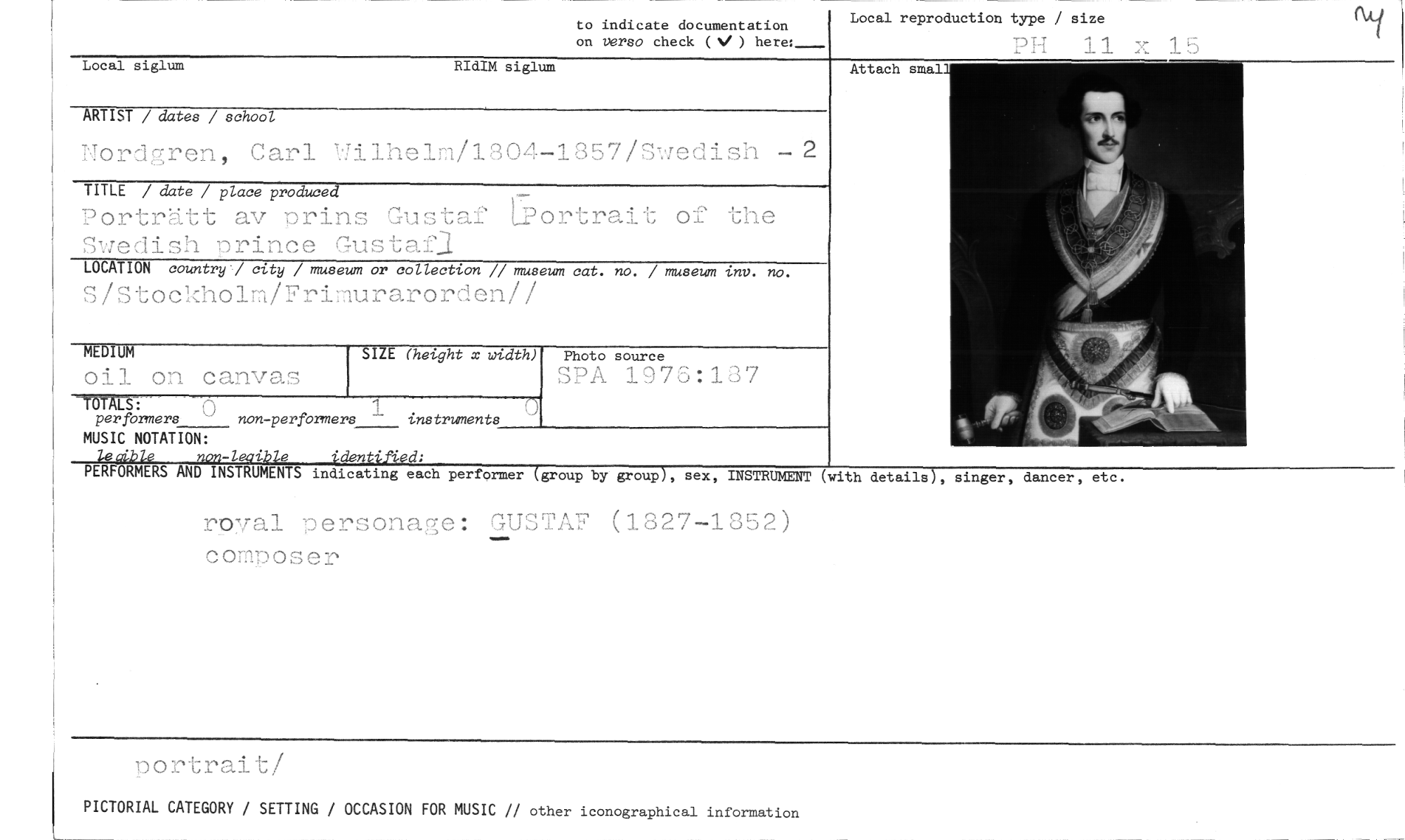 //// Local reproduction type / size //// "PP 1 1 :7 //// Attach //// to indicate documentation //// on verso check (%, ) here:_ //// Local siglum RIdIM siglum //// ARTIST / dates / school //// Nordren, Carl ':iiihelm/1304-1357/Sedish -2 //// TITLE / date / place produced , //// Porträtt av nrins Gusta: LPortrait ox the 7)TeJish 17)rince r',ustafl //// LOCATION country / city / museum or collection // museum cat. no. / museum inc. no. //// S/Stockholm/Frimurarorden// //// Photo source //// 5>PA 1978:137 //// TOTALS: //// perfbrmers non-performers -- instruments //// MUSIC NOTATION: //// Leaible non-leaible identified; //// PERFORMERS AND INSTRUMENTS indicating each performer (group by group), sex, INSTRUMENT (with details), singer, dancer, etc. //// rpyal personage: GUSTAF (1827-1852) comnoser //// nortrait/ //// PICTORIAL CATEGORY / SETTING / OCCASION FOR MUSIC // other iconographical information //// MEDIUM //// oil on canvas //// SIZE (height x width) ////