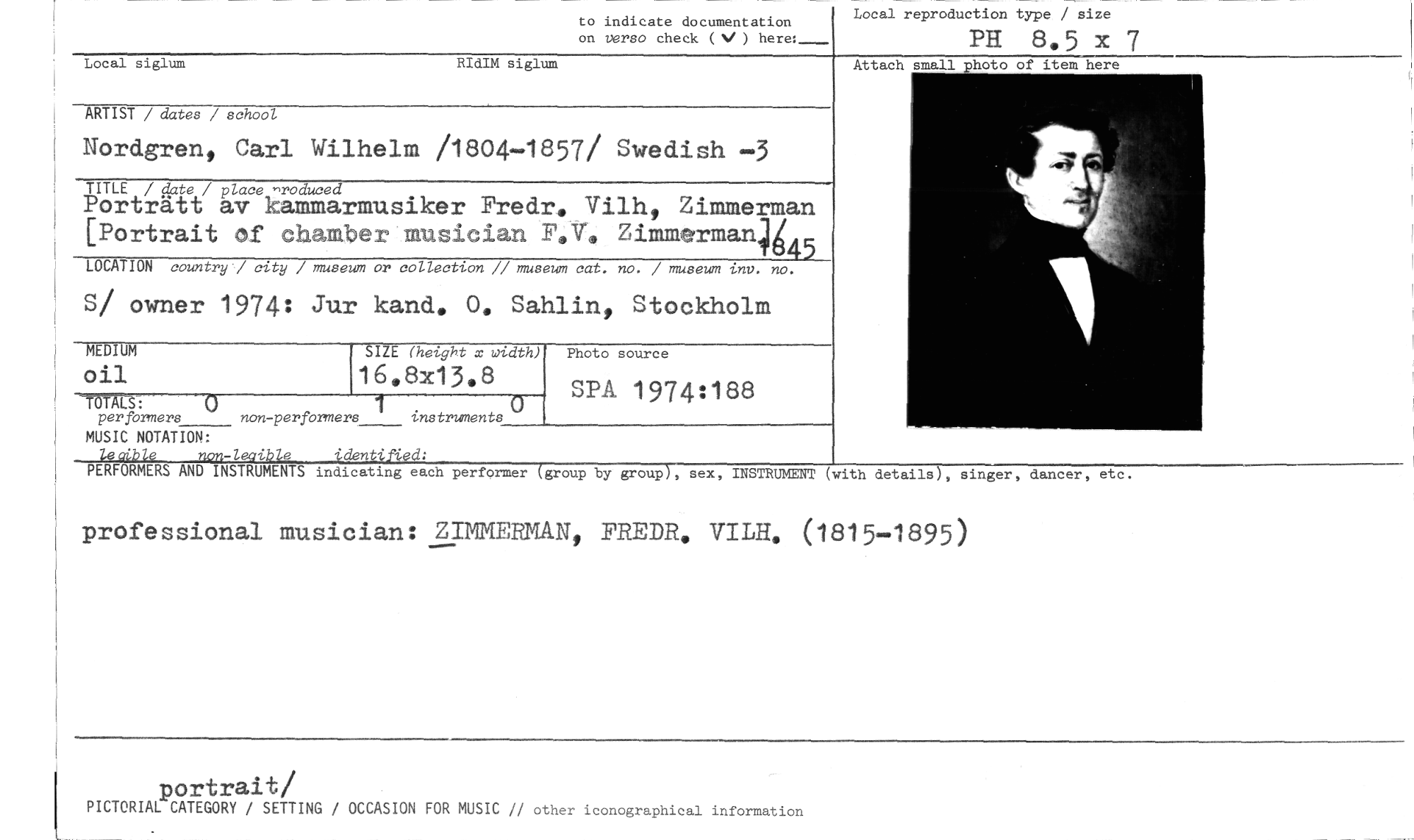 //// to indicate documentation on verso check (N/ ) here: //// Local reproduct.ion type Tsize //// PH 8.5 x 7 //// Local siglum RIdIM siglum //// ARTIST / dates / school //// Nordgren, Carl Wilhelm /1804-1857/ Swedish -3 //// TITLE / date / place Produced //// Porträtt av kammarmusiker Fredr. Vilh, Zimmerman [Portrait of chamber musician Zimmerman445 //// LOCATION country / city / museum or collection // museum cat. no. / museum inv. no. //// S/ owner 1974: Jur kand. 0. Sahlin, Stockholm //// MEDIUM Oil //// TOTALS: 0 1 instruments //// per formers non-perförmers //// MUSIC NOTATION: //// leible non-leaible identified: //// 16.8x13.8 //// SIZE (height x width) //// Photo source //// SPA 1974:188 //// Attach small photo of item here //// PERFORMERS AND INSTRUMENTS indicating each performer (group by group), sex, INSTRUMENT (with details), singer, dancer, etc. //// professional musician: ZIMMERMAN, FRED% VILH. (1815-1895) //// portrait/ //// PICTORIAL CATEGORY / SETTING / OCCASION FOR MUSIC // other iconographical information ////