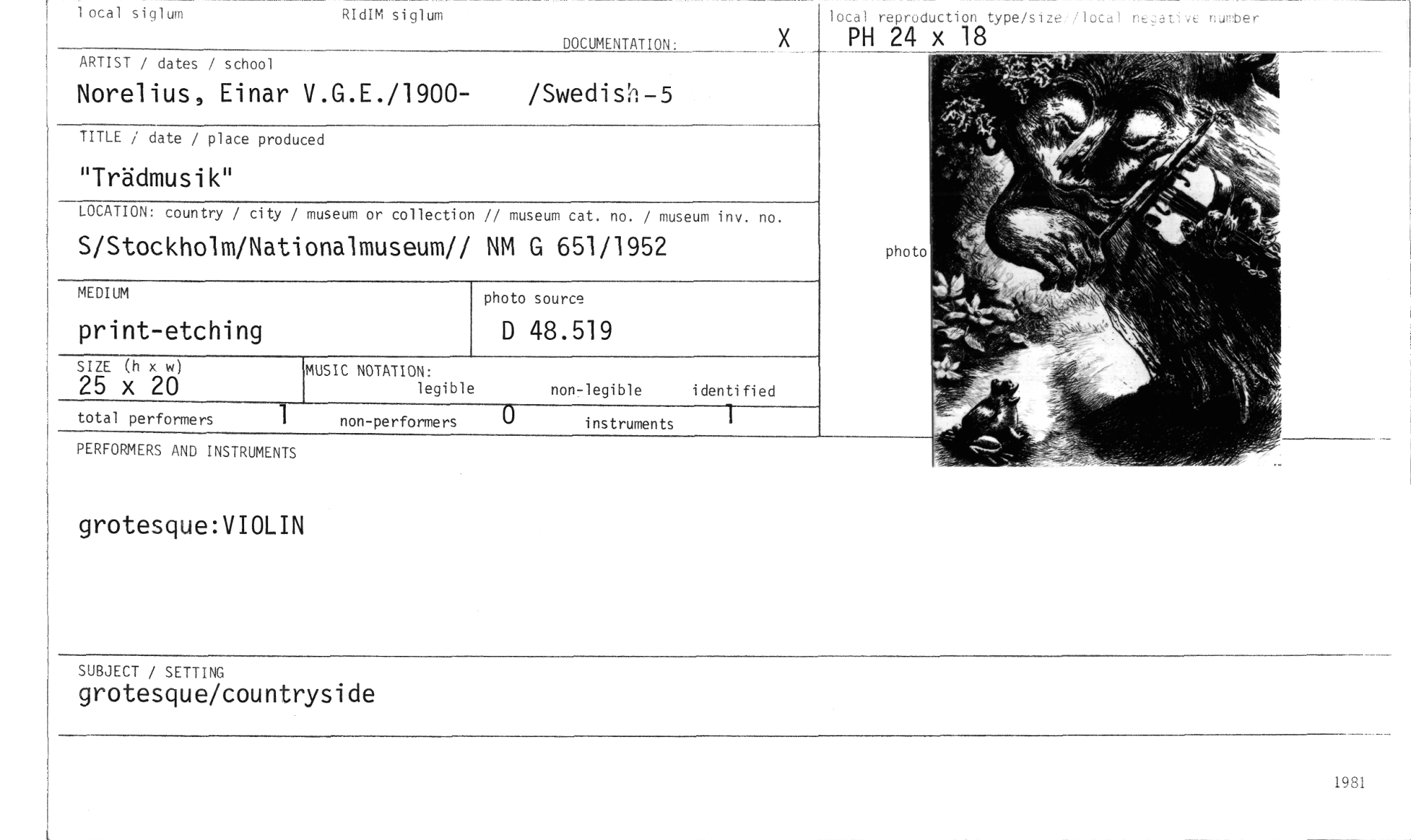 //// SUBJECT / SETTING //// grotesque/countryside //// local siglum RIdIM siglum //// DOCUMENTATION: //// local reproduction type/size //// PH 24 x 18 //// otal ne.:8tIve nutuber //// ARTIST / dates / school //// Norelius, Einar V.G.E./1900- /Swedish-5 //// TITLE / date / place produced //// "Trädmusik" //// LOCATION: country / city / museum or collection // museum cat. no. / museum inv. no. //// S/Stockholm/Nationalmuseum// NM G 651/1952 //// photo source //// D 48.519 //// MUSIC NOTATION: //// legible //// non-legible identified //// total performers //// 1 non-performers 0 instruments //// PERFORMERS AND INSTRUMENTS //// grotesque:VIOLIN //// photo //// 1981 ////