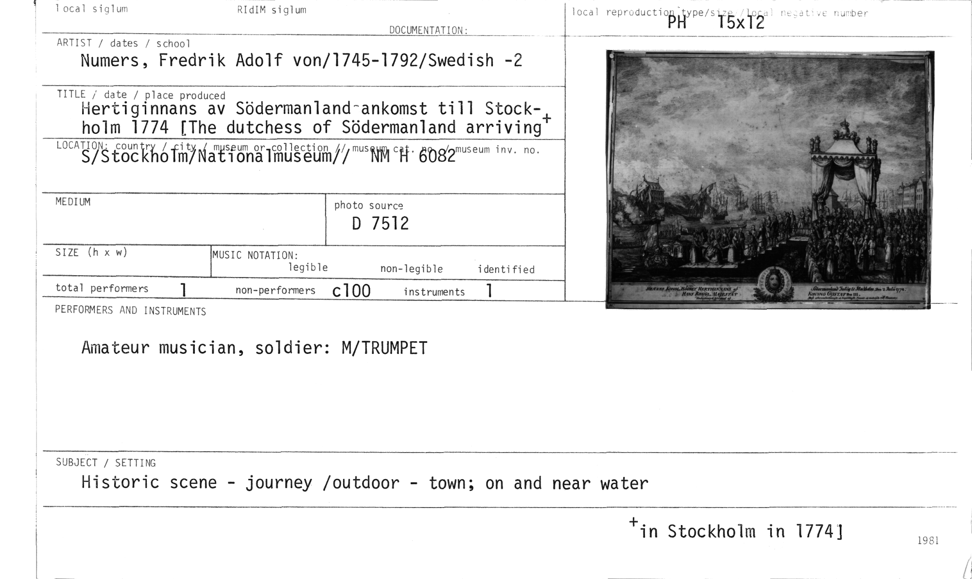 //// 1 local siglum RIdIM siglum //// DOCUMENTATION: //// ARTIST / dates / school //// Numers, Fredrik Adolf von/1745-1792/Swedish -2 //// TITLE / date / place produced //// Hertiginnans av Södermanland-ankomst till Stock-, holm 1774 [The dutchess of Södermanland arriving' //// LOCATION: countrv / _city museum or collection // m //// S/S toc kholm/Nat i ona lmus eum//musQu Nmc 6O8/2m"eum inv. no. //// MEDIUM photo source //// D 7512 //// SIZE (h x w) MUSIC NOTATION: i denti fi ed //// legible non-legible //// total performers 1 non-performers c100 instruments 1 //// PERFORMERS AND INSTRUMENTS //// local reproductiopilype/sylio-a //// ativen umber //// Amateur musician, soldier: M/TRUMPET //// SUBJECT / SETTING //// Historic scene - journey /outdoor - town; on and near water //// +. //// in Stockholm in 1774] //// 1981 ////