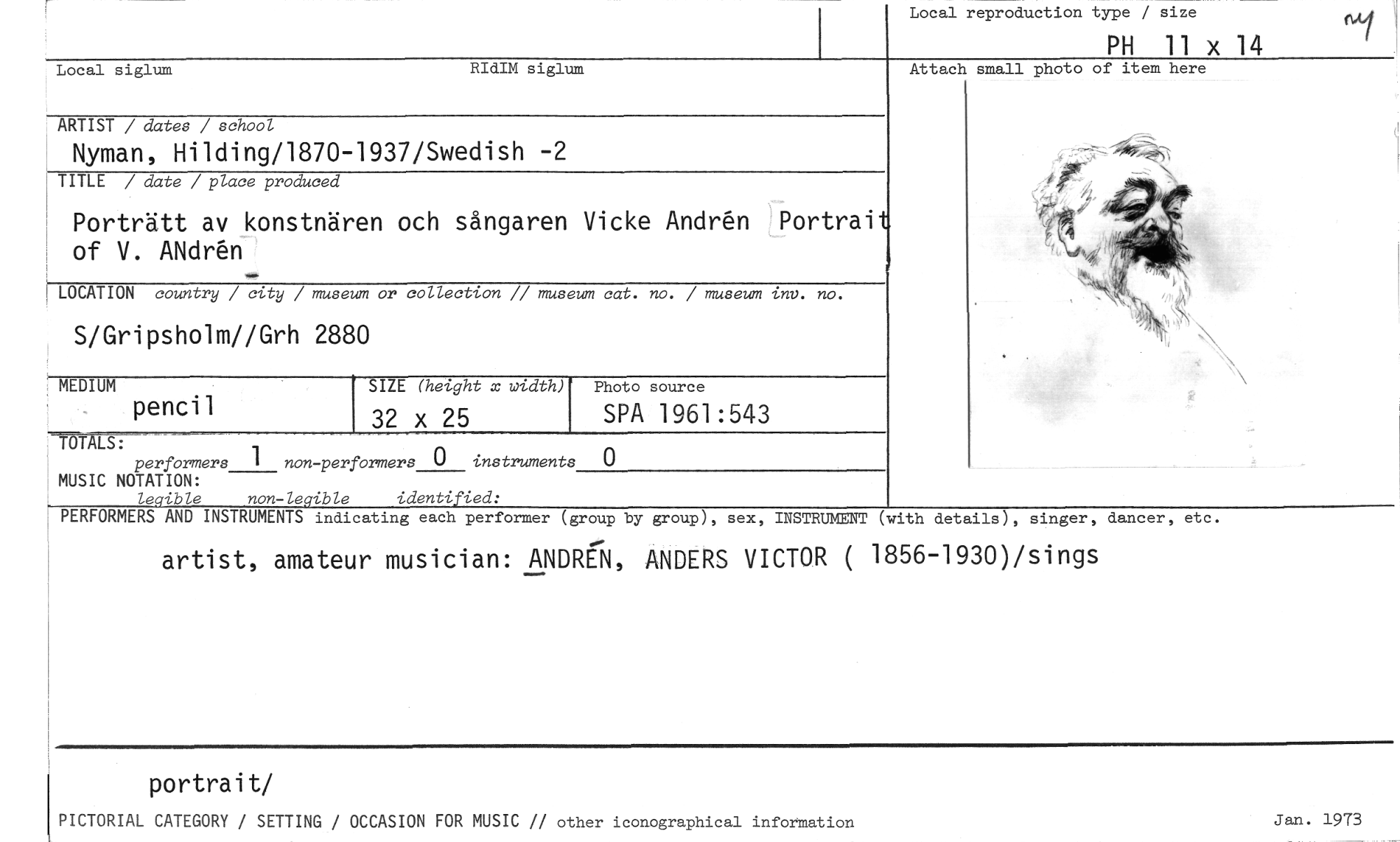 //// Local reproduction type / size //// PH 11 x 14 //// ARTIST / dates / school //// Nyman, Hilding/1870-1937/Swedish -2 //// TITLE / date / place produced //// Porträtt av konstnären och sångaren Vicke Andrén Portrait of V. ANdr&I //// LOCATION country / city / museum or collection // museum cat. no. / museum inv. no. //// S/Gripsholm//Grh 2880 //// MEDIUM //// pencil //// SIZE (height x width) //// 32 x 25 //// Photo source //// SPA 1961:543 //// Attach small photo of item here //// Local siglum RIdIM siglum //// TOT LS: //// performers 1 non-performers 0 instruments 0 //// MUSIC NOTATION: //// legible non-legible identified: //// PERFORMERS AND INSTRUMENTS indicating each performer (group by group), sex, INSTRUMENT (with details), singer, dancer, etc. //// artist, amateur musician: ANDREI, ANDERS VICTOR ( 1856-1930)/sings //// portrait/ //// PICTORIAL CATEGORY / SETTING / OCCASION FOR MUSIC // other iconographical information Jan. 1973 ////