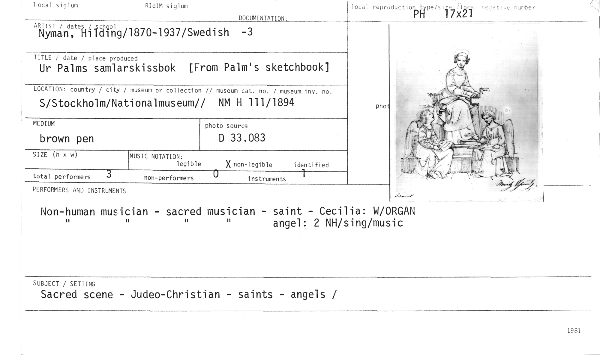 //// 1 ocal siglum RIdIM siglum //// DOCUMENTATION: //// ARTIST / dates /c gol //// Nyman, Hilding/1870-1937/Swedish -3 //// TITLE / date / place produced //// Ur Palms samlarskissbok [From Palm's sketchbook] //// LOCATION: country / city / museum or collection // museum cat. no. / museum inv. no. //// S/Stockholm/Nat ionalmuseum// NM H 111/1894 //// photo source //// D 33.083 //// MUSIC NOTATION: //// legible X non-legible identified //// non-performers instruments 1 //// PERFORMERS AND INSTRUMENTS //// lotal reproductio n kpe/s14e,71qcol neat:ve oarter //// I 1XL I //// MEDIUM //// brown pen //// sizE (h x w) //// total performers //// 3 //// Non-human musician - sacred musician - saint - Cecilia: W/ORGAN //// angel: 2 NH/sing/music //// SUBJECT / SETTING //// Sacred scene - Judeo-Christian - saints - angels / //// 1981 ////
