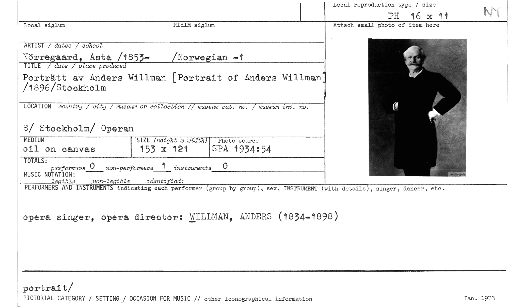 //// Local reproduction type / size //// PH 16 x 11 //// Local siglum RIdIM siglum //// ARTIST / dates / school //// Nörregaard, Asta /1853— /Norwegian —1 //// TITLE / date / place produced //// Porträtt av Anders Willman Portrait of Anders Willman /1896/Stockholm //// LOCATION country / city / museum or collection // museum cat. no. / museum inv. no. //// S/ Stockholm/ Operan //// MEDIUM SIZE (height x width) Photo source //// oil on canvas 153 x 121 SPÅ 1934:54 //// nnuw:-- non-performers 1 instruments 0 //// performers 0 //// MUSIC NOTATION: Attach small photo of item here //// le ible non-le ible identi ied: //// PERFORMERS AND INSTRUMENTS indicating each performer (group //// by group), sex, INSTRUMENT //// (with details), singer, dancer, e //// opera singer, opera director: WILLMAN, ANDERS (1834-1898) //// portrait/ //// PICTORIAL CATEGORY / SETTING / OCCASION FOR MUSIC // other iconographical information //// Jan. 1973 ////
