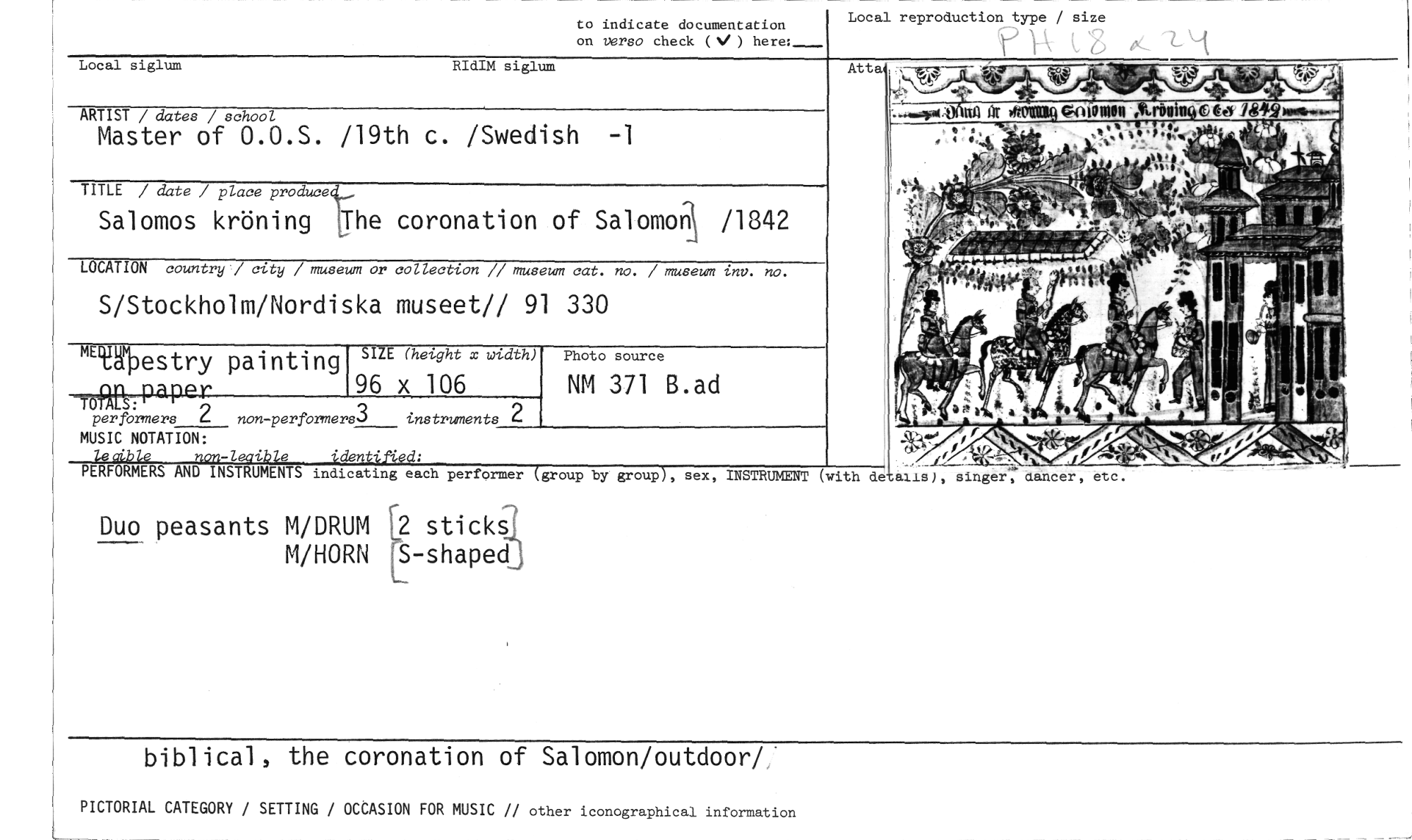 //// to indicate documentation Local reproduction type / size //// on versa check (Ni ) here: //// Local siglum RIdIM siglum //// ARTIST / dates / school //// Master of 0.0.S. /19th c. /Swedish -1 //// TITLE / date / place produce //// Salomos kröning The coronation of Salomo /1842 //// LOCATION country / city / museum or collection // museum cat. no. / museum inv. no. //// S/Stockholm/Nordiska museet// 91 330 //// SIZE (height x width) //// 96 x 106 //// MUSIC NOTATION: //// lecibie non-leaible identified: //// PERFORMERS AND INSTRUMENTS indicating each performer (group by group), //// Duo peasants M/DRUM [2 sticks? //// M/HORN rS-shapedj //// TdfK: 111-1P //// per formers 2 non-performers3 instruments 2 //// 4ghestry painting //// Photo source //// NM 371 B.ad //// Atta //// sex, INSTRUMENT (with de alls), singer, cancer, etc. //// biblical, the coronation of Salomon/outdoor/ //// PICTORIAL CATEGORY / SETTING / OCCASION FOR MUSIC // other iconographical information ////