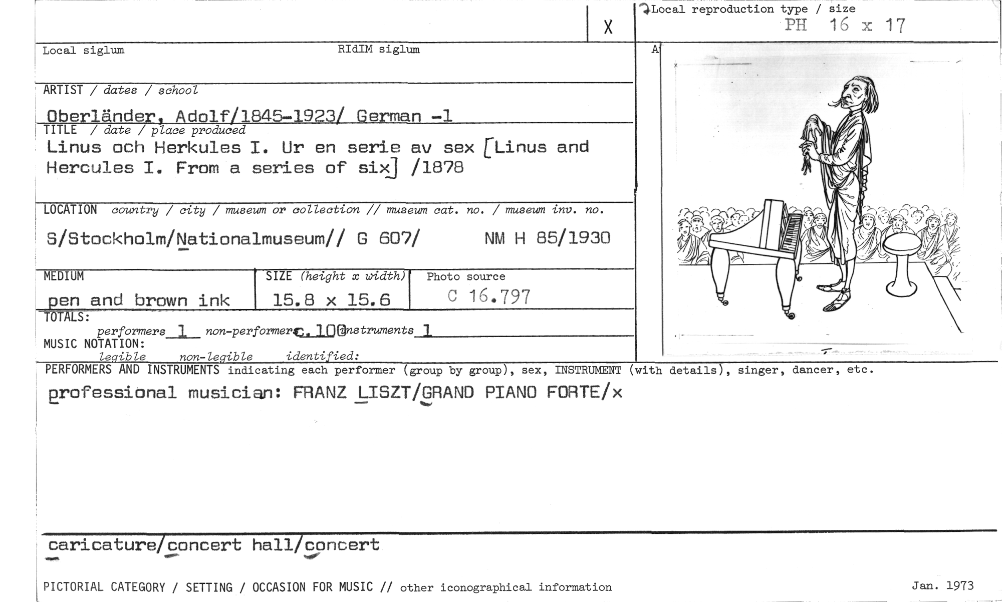 //// 14.Local reproduction type / size //// PH 16 x 17 //// Local siglum RIdIM siglum //// ARTIST / dates / school //// Oberländer, Adolf/1845-1923/ German —1 //// TITLE / date / place produced //// Linus och Herkules I. Ur en serie av sex [Linus and Hercules I. From a series of six] /1878 //// LOCATION country / city / museum or collection // museum cat. no. / museum inv. no. //// S/Stockholm/Nationalmuseum// G 607/ NM H 85/1930 //// MEDIUM //// Photo source //// C 16.797 //// • //// en and brown ink //// SIZE (hetght x width) //// 15.8 x 15.6 //// TOT S: //// performers 1 non-performer<L1ffinstruments 1 MUSIC NOTATION: //// legible non-legible identified: //// PERFORMERS AND INSTRUMENTS indicating each performer (group by group), sex, INSTRUMENT (with //// professional musician: FRANZ LISZT/GRAND PIANO FORTE/x //// A //// details), singer, dancer, etc. //// caricature/concert hall/concert //// PICTORIAL CATEGORY / SETTING / OCCASION FOR MUSIC // other iconographical information Jan. 1973 ////