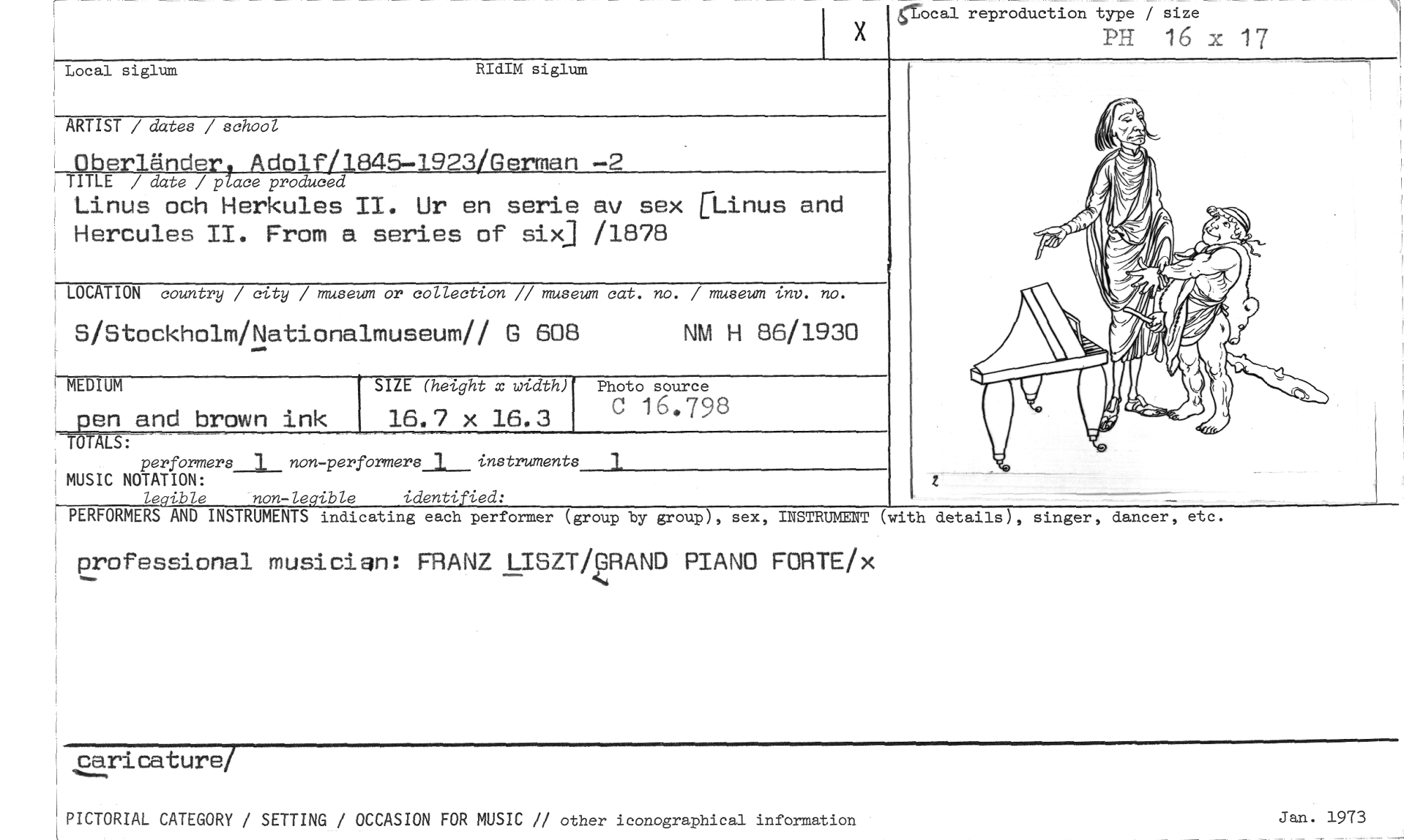 //// professional musician: FRANZ LISZT/eAND PIANO FORTE/x //// caricature/ //// PICTORIAL CATEGORY / SETTING / OCCASION FOR MUSIC // other iconographical information Jan. 1973 //// 6tocal reproduction type / size //// PH 16 x 17 //// Local siglum RIdIM siglum //// ARTIST / dates / school //// Oberländer, Adolf/1845-1923/German —2 //// TITLE / date /place produced //// Linus och Herkules II. Ur en serie av sex [Linus and Hercules II. From a series of sixj /1878 //// LOCATION country / city / museum or collection // museum cat. no. / museum inc. no. //// S/Stockholm/Nationalmuseum// G 608 NM H 86/1930 //// MEDIUM SIZE (height x width) //// pen and brown ink 16.7 x 16.3 //// performers 1 non-performersJ instruments //// MUSIC NOTATION: //// leqible non-legible identified: //// Photo source C 16.798 //// 1 //// PERFORMERS AND INSTRUMENTS indicating each performer //// (group by group), sex, //// INSTRUMENT (with //// details), singer, dancer, etc. ////