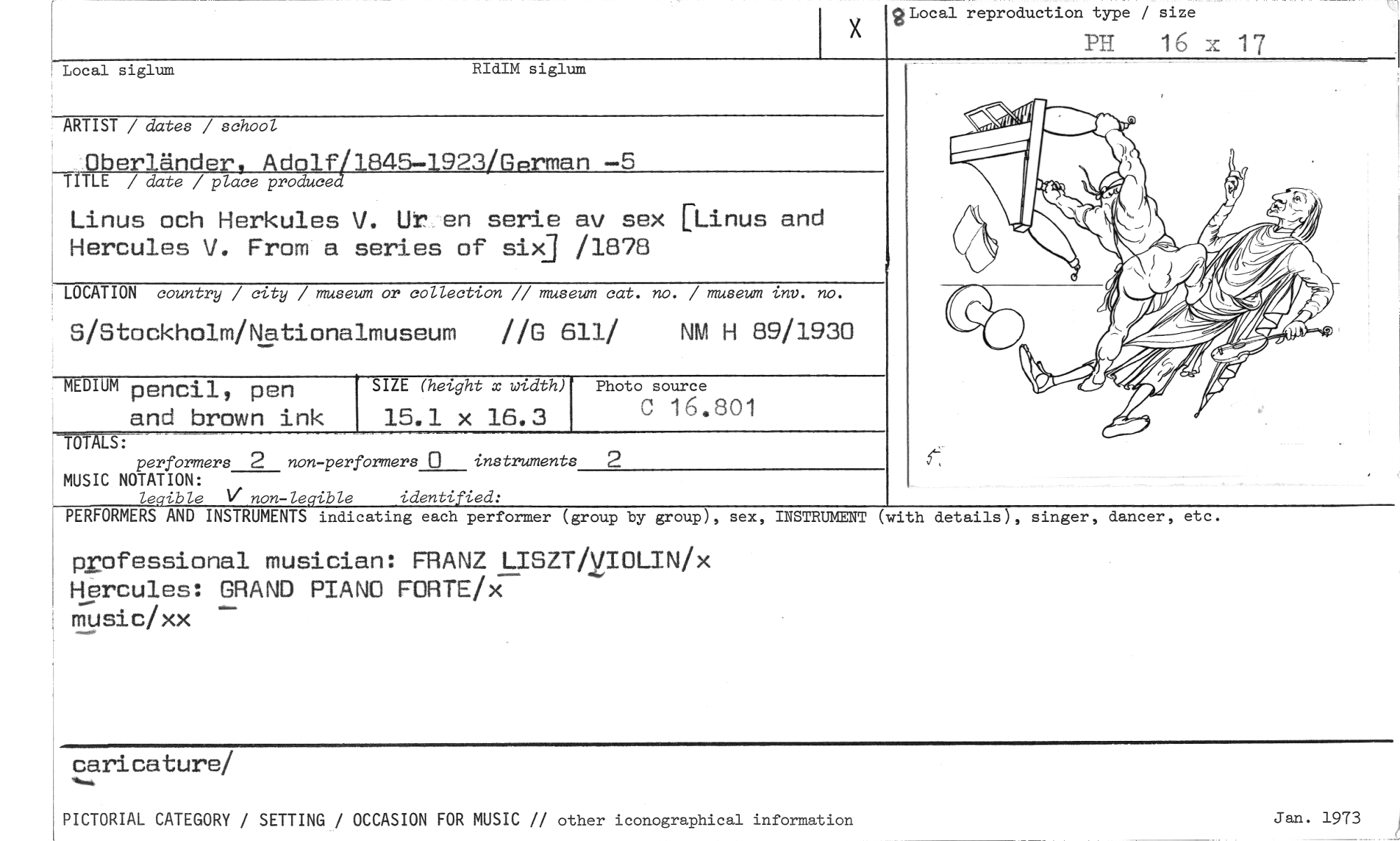 //// 2Local reproduction type / size //// PH 16 x //// Local siglum RIdIM siglum //// ARTIST / dates / school //// Oberländer, Adolfy1845-1923/Gprman —5 //// TfTLE / date / place produce //// Linus och Herkules V. Ut en serie av sex [Linus and Hercules V. From a series of six] /1878 //// LOCATION country / city / museum or collection // museum cat. no. / museum inv. no. //// S/Stockholm/Nationalmuseum //G 611/ NM H 89/1930 //// MEDIUM pencil, pen and brown ink SIZE (height x width) Photo source //// 15.1 x 16.3 C 16.801 //// //// TOTALS: //// performers 2 non-performers 0 instruments 2 MUSIC NOTATION: //// legible non-legible identified: //// PERFORMERS AND INSTRUMENTS indicating each performer (group by group), sex, INSTRUMENT (with details), singer, dancer, //// professional musician: FRANZ LISZTi,VIOLIN/x Hercules: GRAND PIANO FORTE/X //// music/xx //// etc. //// caricature/ //// PICTORIAL CATEGORY / SETTING / OCCASION FOR MUSIC // other iconographical information Jan. 1973 ////