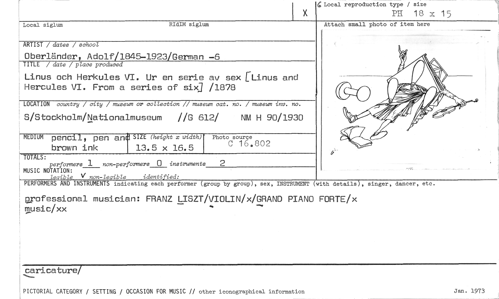 //// Local reproduction type / size //// PH 18 x 15 //// Attach small photo of item here //// Local siglum RIdIM siglum //// ARTIST / dates / school //// Oberländer, Adolf/1845-1923/German —6 //// TITLE / date / place produced //// Linus och Herkules VI. Ur en serie av sex [Linus and Hercules VI. From a series of six] /1878 //// LOCATION country / city / museum or collection // museum cat. no. / museum inv. no. //// S/Stockholm/Nationa1museum //G 612/ //// MEDIUM penci 1 , pen and SIZE (height x width ) Photo source //// C 16.802 //// TOTALS: //// performers 1 non-performers 0 instruments 2 //// MUSIC NOTATION: //// legible V non-legible identified: //// PERFORMERS AND INSTRUMENTS indicating each performer (group //// arofessional musician: FRANZ LISZT/VIOLIN/x/GRAND //// NM H 90/1930 //// brown ink 13.5 x 16.5 //// music/xx //// by group), sex, INSTRUMENT (with details), singer, dancer, etc. //// PIANO FORTE/x //// caricature/ //// PICTORIAL CATEGORY / SETTING / OCCASION FOR MUSIC // other iconographical information //// Jan. 1973 ////
