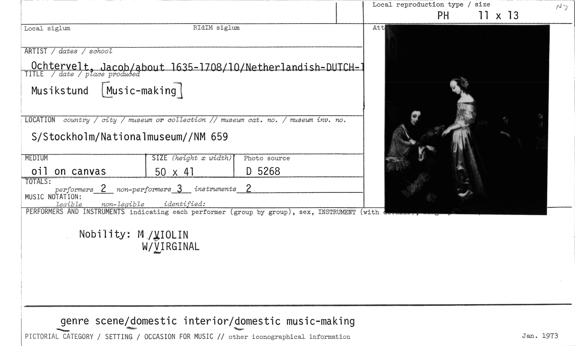 //// Local reproduction type / size //// PH 11 x 13 //// Local siglum RIdIM siglum //// ARTIST / dates / school //// Ochter • IB .18 e: 8 1- .- .a. a //// TITLE / date / p ace produce. //// Musikstund [Music-making //// LOCATION country / city / museum or collection // museum cat. no. / museum viv. no. //// S/Stockholm/Nationalmuseum//NM 659 //// MEDIUM //// oil on canvas //// SIZE (height x width) Photo source //// 50 x 41 D 5268 //// TÖTALS: //// performers 2 non-performers_l__ instruments 2 MUSIC NOTATION: //// leqible non-legible identified: //// PERFORMERS AND INSTRUMENTS indicating each performer (group by group), sex, INSTRUMENT //// W/VIRGINAL //// genre scene/domestic interior/domestic music-making //// PICTORIAL CATEGORY / SETTING / OCCASION FOR MUSIC // other iconographical information //// Jan. 1973 ////