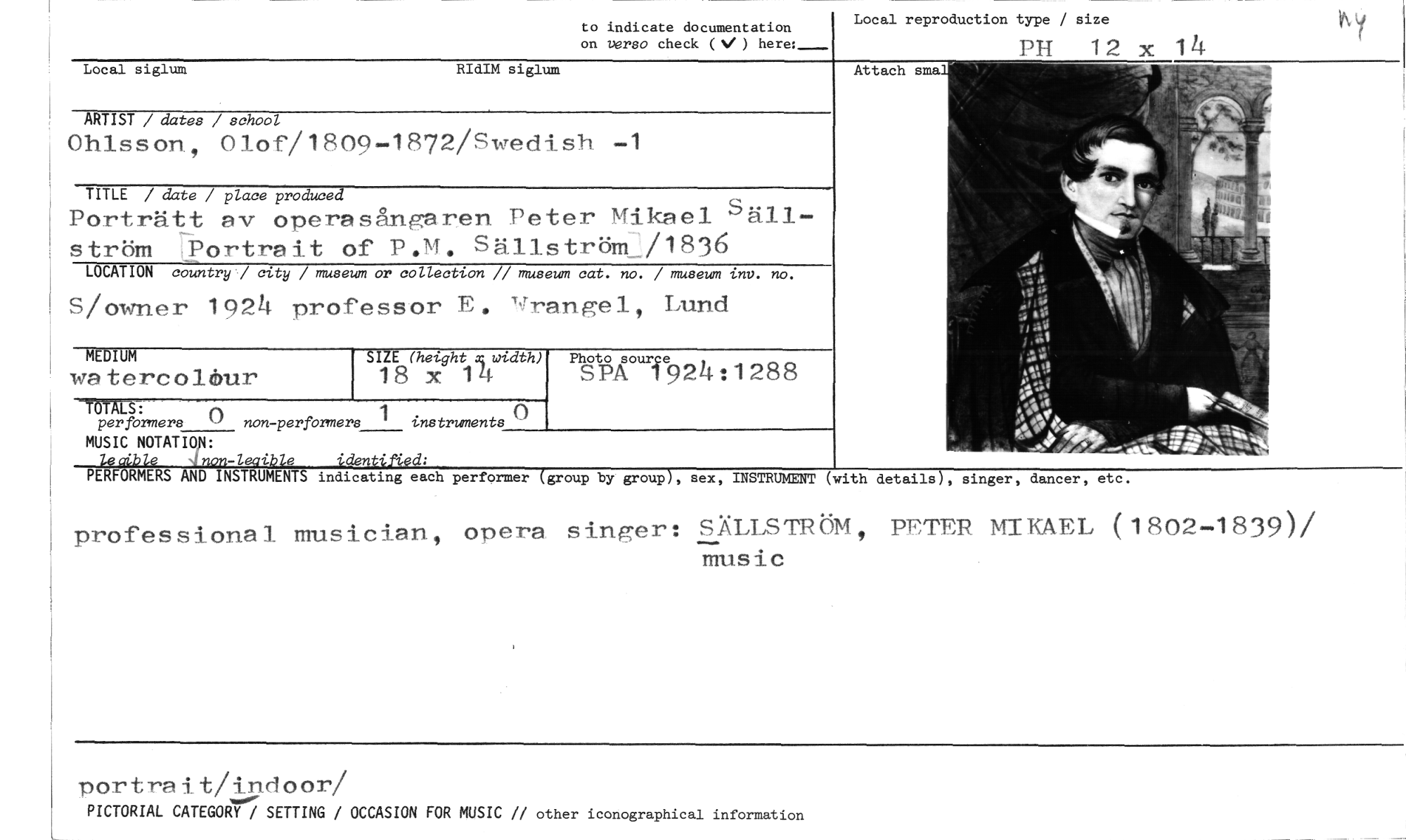 //// Local reproduction type / size //// PH 12 x 1 //// Attach sma //// to indicate documentation //// on verso check (%, ) here:_ //// Local siglum RIdIM siglum //// ARTIST / dates / school //// Ohlsson, Olof/1809-1872/Swedish -1 //// TITLE / date / place produced //// Porträtt av operasångaren Peter Mikael Säll-ström 7Portrait of P.M. Sällström:/1836 //// LOCATION country / city / museum or collection // museum cat. no. / museum inv. no. //// S/owner 1924 professor E. vrangel, Lund //// SIZE (height width) //// 18 x 14 //// TÖTALS: //// per formera () non-perfbrmers 1 instruments //// MUSIC NOTATION: //// lecible identified: //// MEDIUM //// watereoldrur //// TWT924:1288 //// PERFORMERS AND INSTRUMENTS indicating each performer (group by group), sex, INSTRUMENT (with details), singer, dancer, etc. //// professional musician, opera singer: SÄLLSTRÖM, PETER MIKAEL (1802-1839)/ //// music //// portnnit/indoor/ //// PICTORIAL CATEGORY / SETTING / OCCASION FOR MUSIC // other iconographical information ////