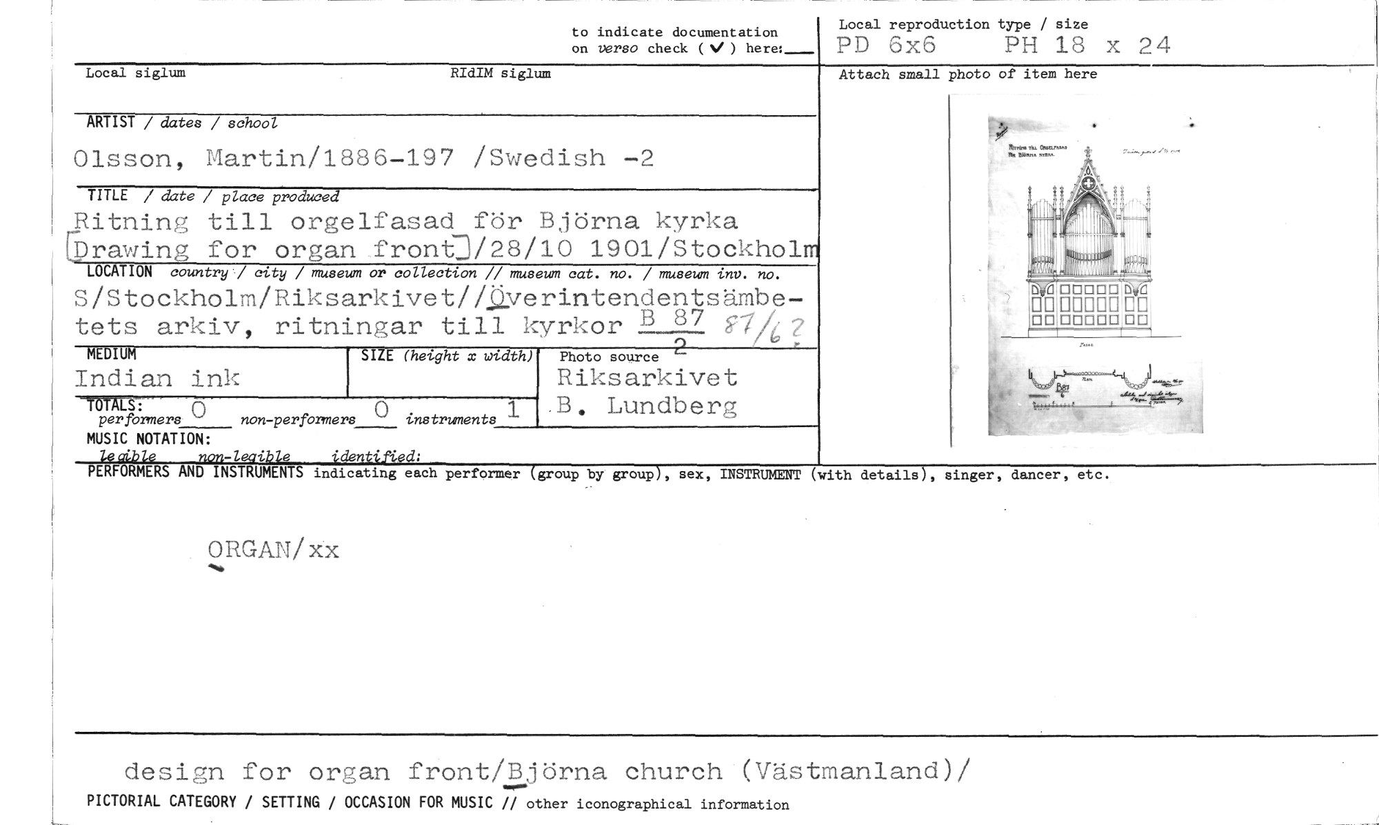 //// to indicate documentation //// on verso check (V) here: //// Local reproduction type / size //// PD 6x6 PH 18 x 24 //// Local siglum RIdIM siglum //// Attach small photo of item here //// ARTIST / dates / school //// Olsson, Martin/1886-197 /Swedish -2 //// TITLE / date / place produced //// Ritning till orgelfasad för Björna kyrka rawing for organ front]/28/10 1901/Stockholm //// LOCATION country / city / museum or collection // museum cat. no. / museum inv. no. //// S/Stockholm/Riksarkivet/yerintendentsämbe - //// tets arkiv, ritningar till kyrkor B 87 Y-147 //// MEDIUM - SIZE (height x width) Photo source 2 //// Indian ink Riksarkivet //// Turks: 0 1 B. Lundberg //// per formers non-perfOrmers instruments //// MUSIC NOTATION: //// lecdble non-leaible identified; //// PERFORMERS AND INSTRUMENTS indicating each performer (group by group), sex, INSTRUMENT (with details), singer, dancer, etc. //// ORGAN/xx //// design for organ front/Björna church (Västmanland)/ //// PICTORIAL CATEGORY / SETTING / OCCASION FOR MUSIC // other iconographical information ////